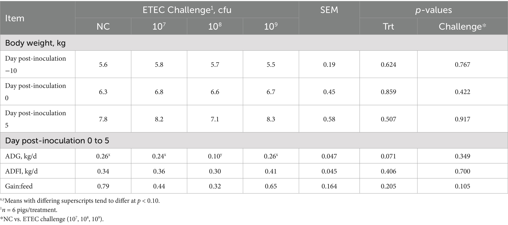 Table 2. Pig body weight and performance parameters pre- and post-F18 enterotoxigenic Escherichia coli (ETEC) inoculation challenge.