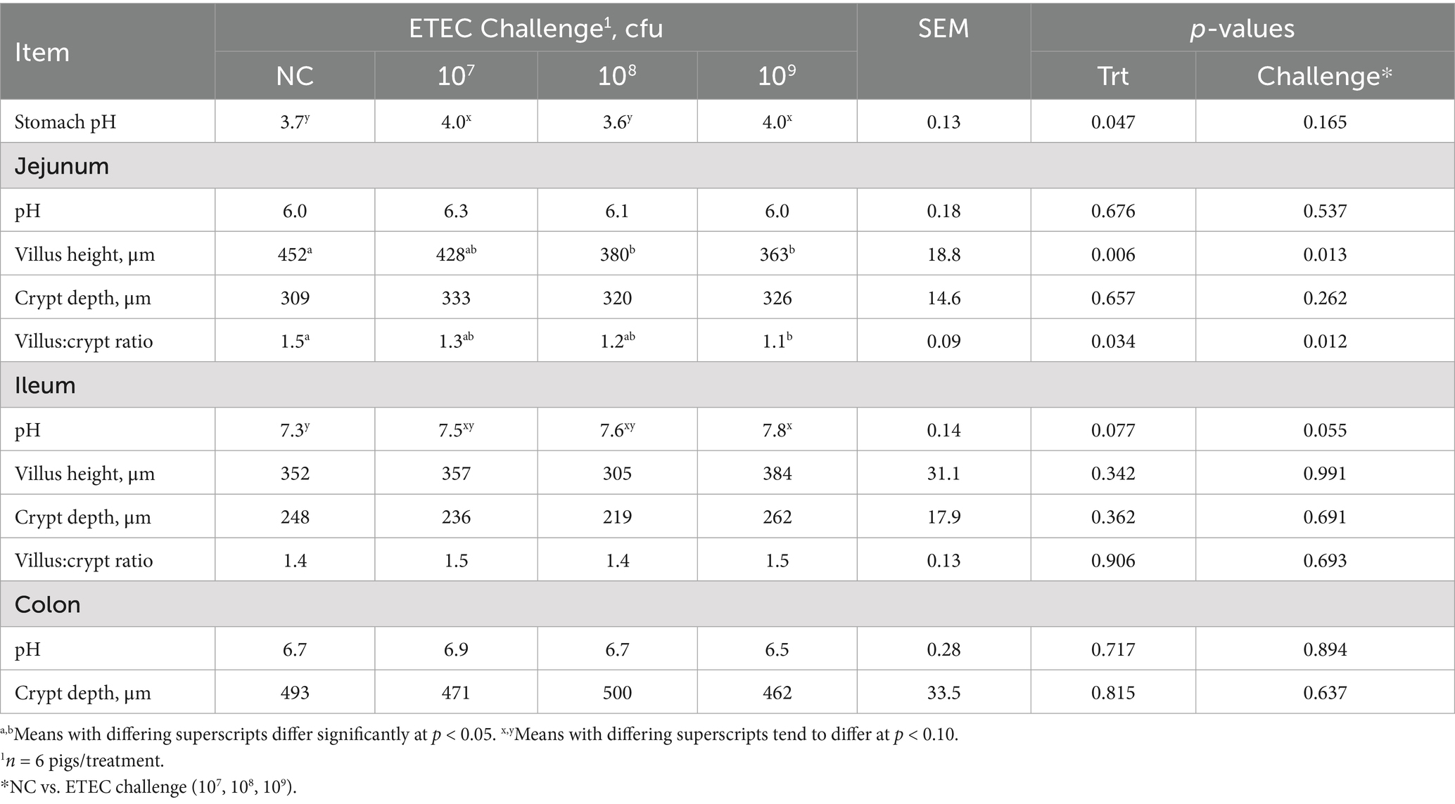 Table 3. Luminal pH and intestinal morphology in the stomach, jejunum, ileum, and colon of pigs challenged with either 0 (NC), 107, 108, or 109 cfu of F18 enterotoxigenic Escherichia coli (ETEC) after 5 days.