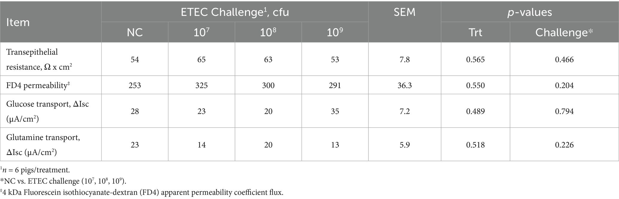 Table 4. Ex vivo ileum barrier integrity and active transport function in pigs after a 5-day 0 (negative control, NC), 107, 108, or 109 cfu F18 enterotoxigenic Escherichia coli (ETEC) challenge.