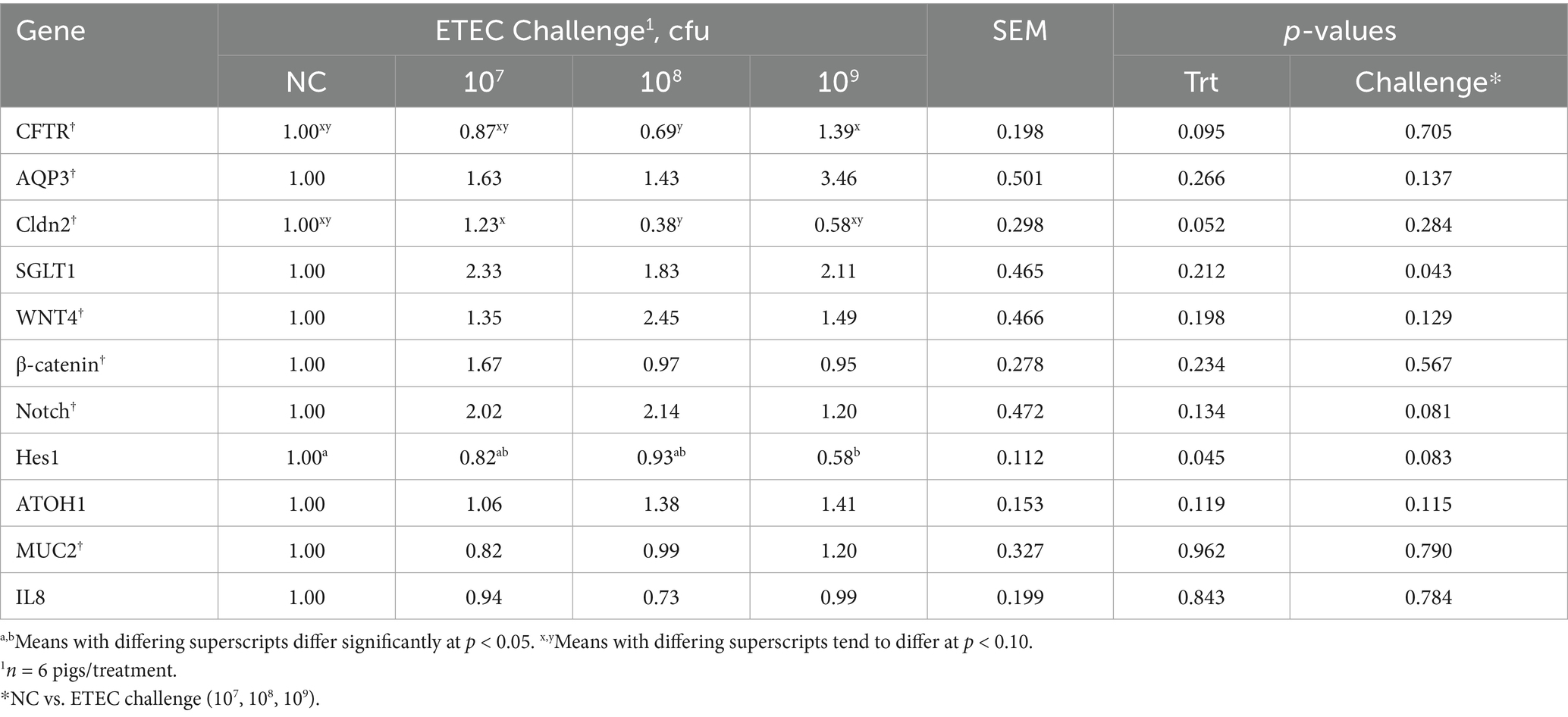 Results: ETEC-challenged pigs had higher fecal scores than NC (p = 0.01), without differences in average daily feed intake or gain:feed (p > 0.10). Average daily gain tended to be lower in the 108 ETEC group compared to the NC (p = 0.07). In ETEC pigs, F18 and LT gene abundances were elevated (p < 0.001) and F18 attachment increased across all intestinal segments (p < 0.10), being greatest in the ileum (p < 0.001). CFTR protein abundance increased in all regions with ETEC challenge (p < 0.05), and Ki67 abundance tended to be lowest in the 109 group (p = 0.08). Notch expression tended to increase (p = 0.08) and Hes1 tended to decrease (p = 0.08) with ETEC challenge, suggesting altered epithelial renewal dynamics. Nutrient transport, TER, and FD4 flux were unaffected (p > 0.10).