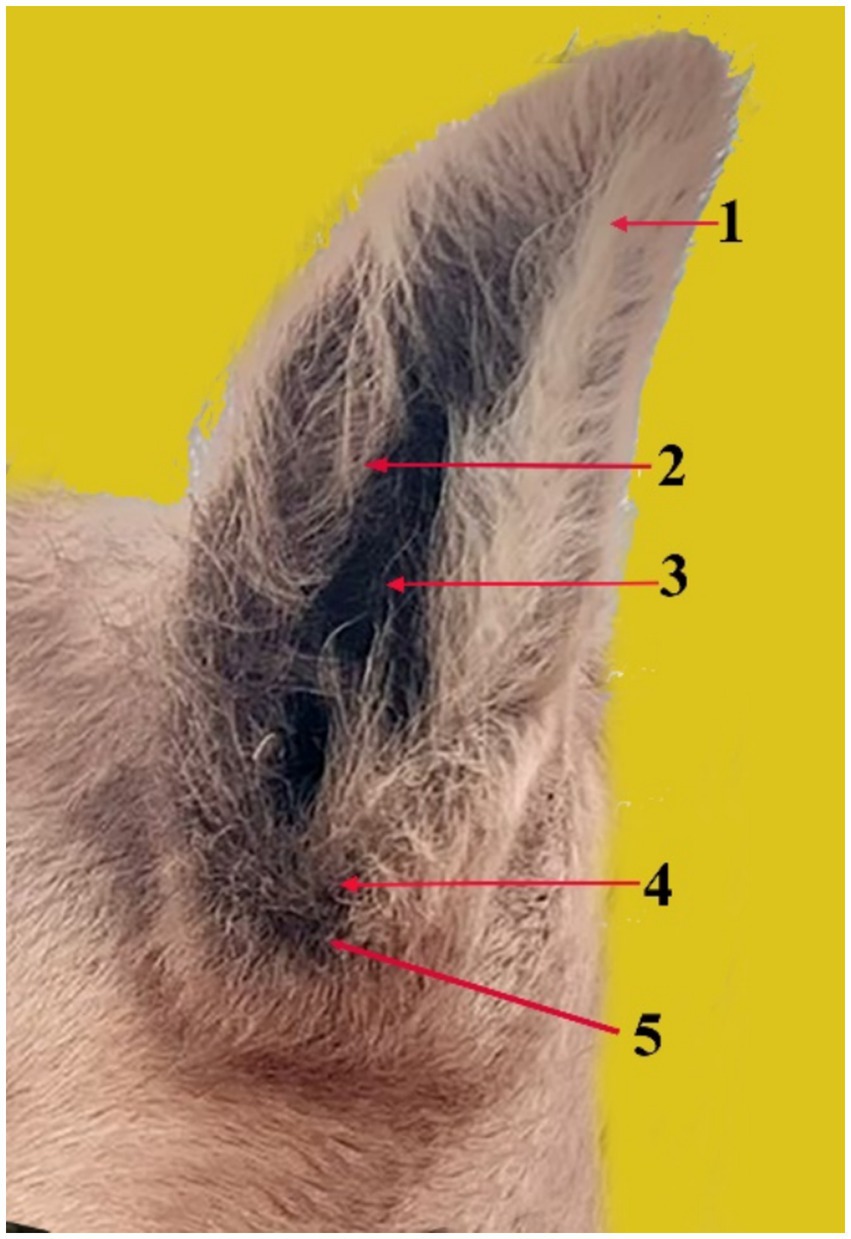 Figure 1. The pinna (auricle) and its components in the dromedary camel (1), showing the antihelix ridge (2), the antihelix fossa (3), the tragus (4), and the antitragus notch (5).