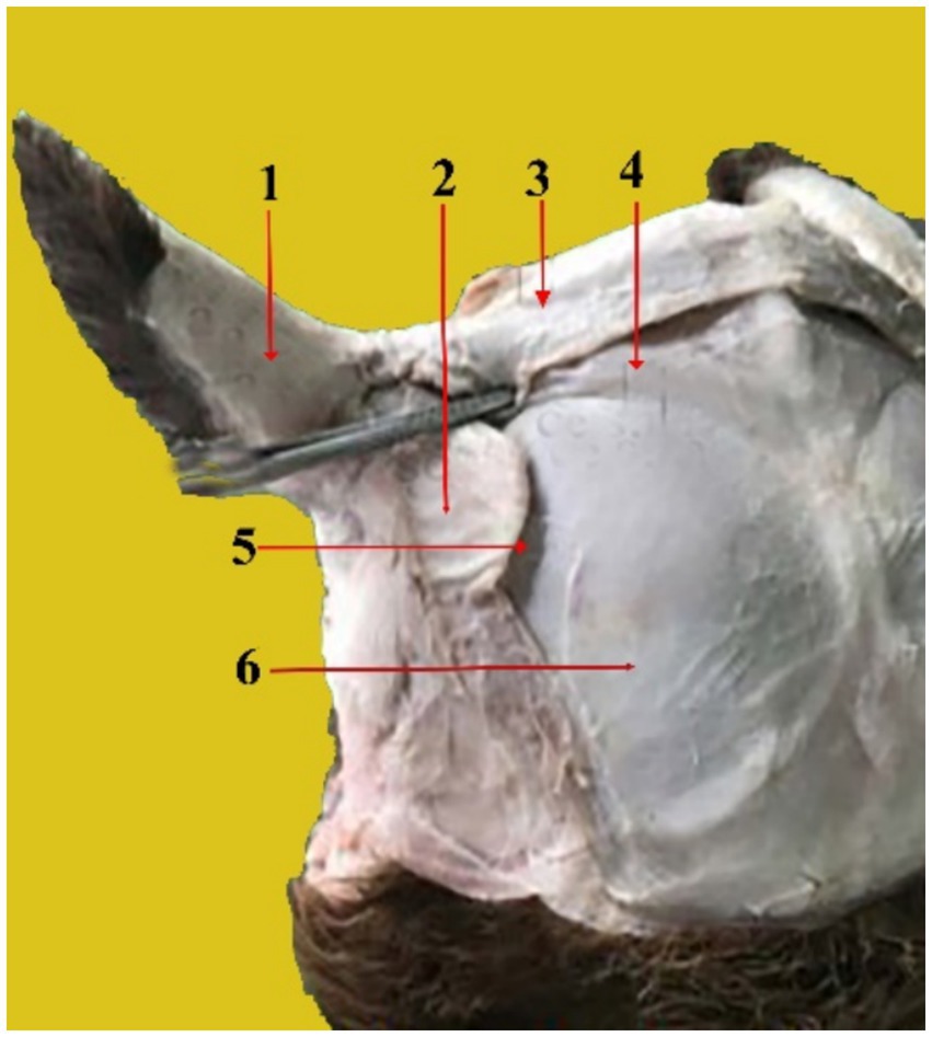 Figure 2. Caudal view of the dissected camel head showing the auricle cartilage (1), scutiform cartilages (2), Interscutular muscle (3), cervico-scutolar muscle (4), deep scutulo-auricular muscle (5), and temporal muscle (6).
