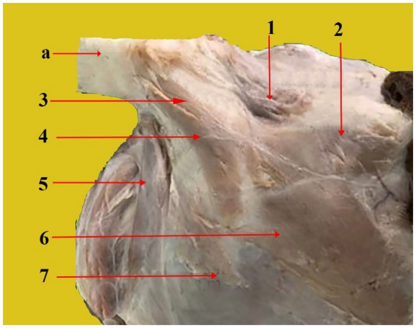 Figure 4. Rostral, dorsal, and cranial views of a dissected dromedary camel head showing the different muscles that are attached to the auricular cartilage. From the top to the bottom of the picture: Auricle cartilage (a), superficial scutulo-auricular muscle (1), fronto-scutular muscle (2), middle scuto-auricular muscle (3), dorsal scuto-auricular muscle (4), parotidoauricular muscle (5), zygomatico-auricular muscle (6), and zygomatico-scutular muscle (7).