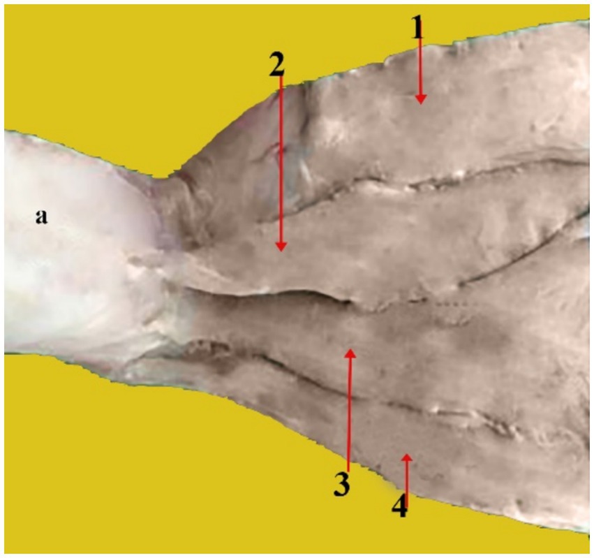 Figure 5. Caudal view of a dissected camel head showing the caudal auricular muscles: Auricular cartilage (a), Interscutular muscle (1), superficial cervico-auricular muscle (2), middle cervico-auricular muscle (3), and deep cervico-auricular muscle (4).
