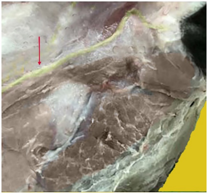 Figure 6. Anatomical position of the greater auricular nerve. The nerve shown in yellow, indicated by the red arrow, supplies the camel auricle.