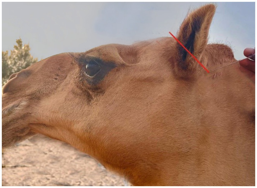 Figure 7. An image displaying the location site of the internal auricular nerve block in the dromedary camel (Red arrow).