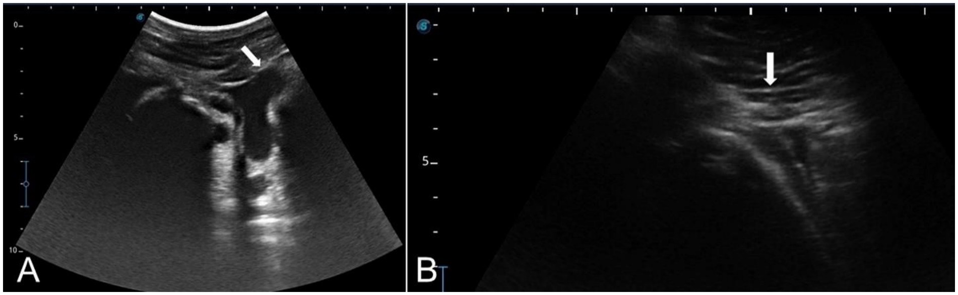 Figure 9. Linear ultrasound images showing the auricular nerve at the distal third of a live camel’s ear. (A) Great auricular nerve. (B) Internal auricular nerve.