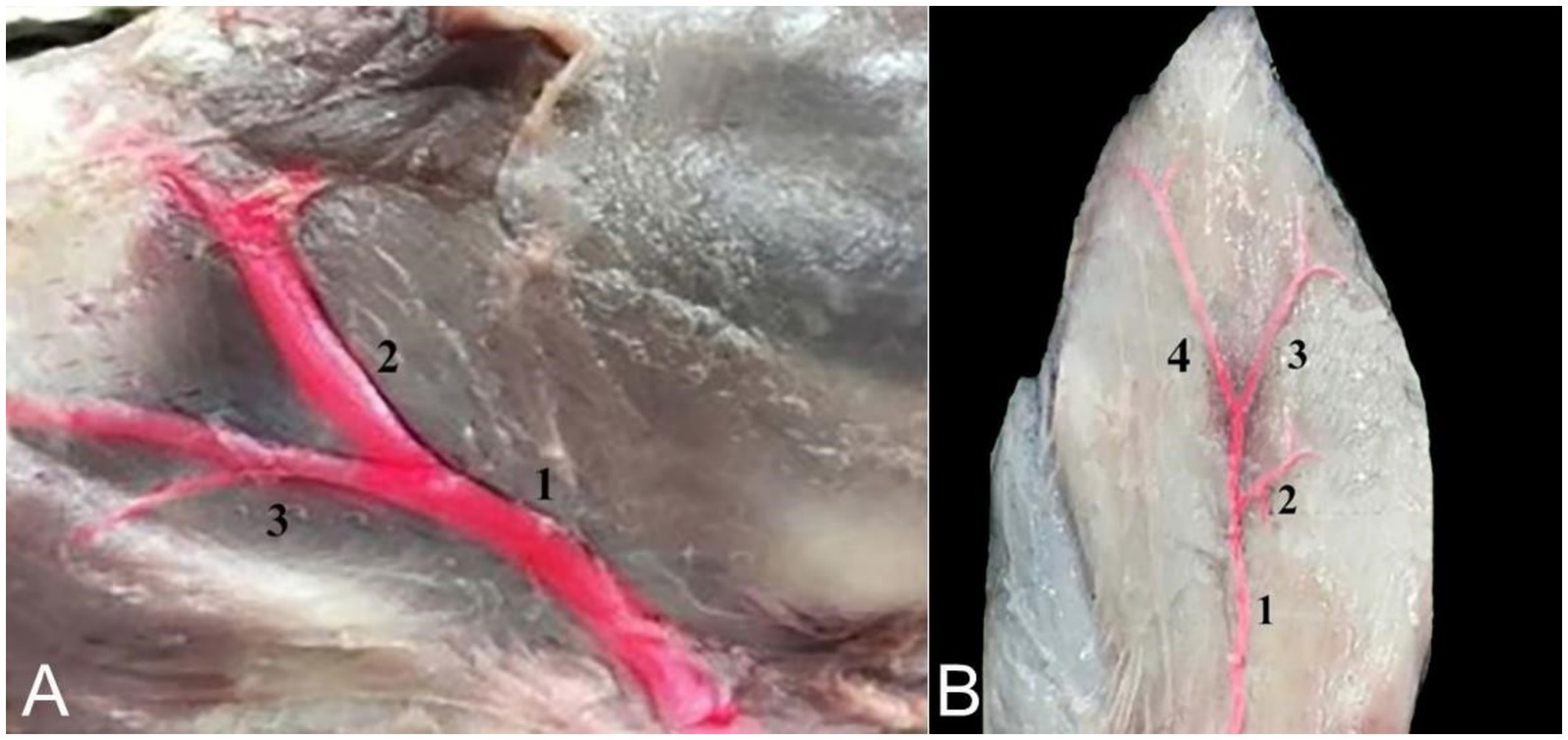 Figure 10. (A) An image showing the blood supply of the camel auricle: Superficial temporal artery (1), rostral auricular artery (2), and maxillary artery (3). (B) An image showing the blood supply to the cartilages of the camel ear: Caudal auricular artery (1), medial auricular branch (2), intermediate auricular branch (3), and lateral auricular branch (4).