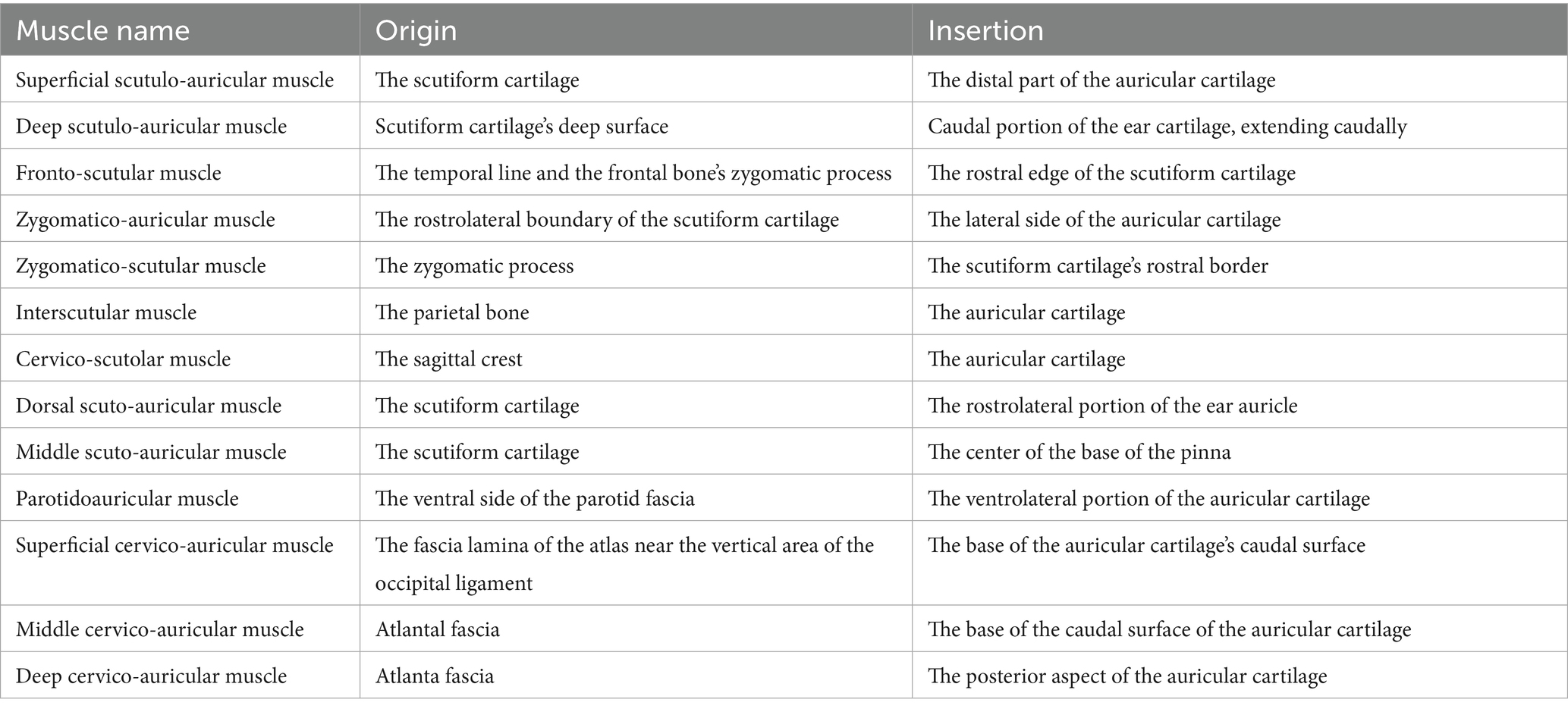 The movement of the ear is caused by several ear muscles. These muscles are divided into four muscle groups: rostral (five muscles), dorsal (four muscles), ventral (one muscle), and caudal (three muscles) (Table 1). These muscles are identical to those found in domestic animals in their origin, position, orientation, and insertion (3, 5). While the anatomy of these muscles has been well described in other mammalian species, this is the first detailed report on the dromedary camel’s outer ear muscles. The auricular muscles are widely believed to have minimal functional value (28). However, these ear muscles play a crucial role, as they allow the animal to move its ears toward surrounding sounds (13, 29).