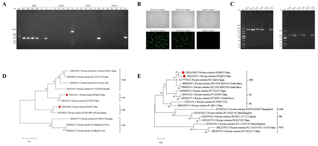 Figure 1. Virus isolation, phylogenetic tree construction and sequence analysis. This figure provides an overview of the virus isolation, phylogenetic tree construction, and sequence analysis, with all experiments performed in three independent replicates to ensure statistical robustness. (A) RT-PCR detection results of diarrhea-associated viruses in fecal samples. M: DL2000 DNA Marker; R1~R4: Diarrheal Samples; 5/11/17/23: Negat0ive control; 6/12/18/24: Positive control of PoRV, PEDV, TGEV and PDCoV. (B) CPE and IFA Analysis of MA104 Cells Inoculated with Filtrate from Sample R1 and R4 at the Third Passage(40×). (C) RT-PCR successfully amplified the VP4 and VP7 genes from both the P3 and P8 passages of HYuR01 and HYuR02 isolates, demonstrating that these viral strains are well-adapted to cell culture and capable of stable propagation through serial passages. (D, E) Phylogenetic analyses based on the VP7 and VP4 genes were performed to determine the G and P genotypes of the HYuR01 and HYuR02 isolates, respectively. The experimental strains are marked in red.