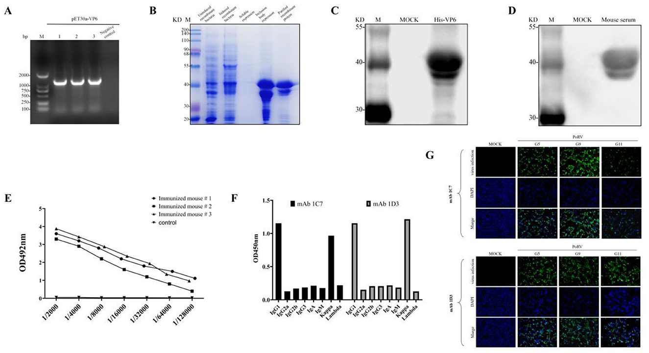 Figure 2. Preparation of Monoclonal Antibodies Against Rotavirus VP6 Protein. This figure illustrates the construction of the pET30a-VP6 prokaryotic expression vector, protein purification, animal immunization, serum antibody detection, and the application of mAbs 1C7/1D3 in indirect immunofluorescence assays, with all experiments conducted in three independent replicates to ensure statistical robustness. (A) Colony PCR Verification of the pET-30a-VP6 Recombinant Plasmid. (B) Induced Expression and Protein Purification of the Recombinant Strain pET-30a-VP6-BL21(DE3)Plyss. (C) Recombinant VP6 protein was identified using an anti-His monoclonal antibody. (D) Recombinant VP6 protein was verified with PoRV-positive serum. (E) Serum antibody titers were determined via indirect enzyme-linked immunosorbent antibody assay(ELISA). (F) Isotype and Subclass Characterization of mAbs 1C7/1D3. (G) Fluorescent Reactions of mAbs 1C7/1D3 to Three Genotypes of PoRV (100 μm).