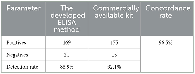 The optimal reaction conditions for the indirect ELISA were developed using a matrix method, optimizing multiple parameters according to the standard protocol (22): coating concentration of purified VP6 protein (1.0, 2.0, 4.0, 8.0, 16.0 μg/ml), dilution factors for monoclonal antibody and negative mouse serum (1:5,000, 1:10,000, 1:20,000, 1:40,000), blocking solution (1% BSA, 2% BSA, 5% skim milk, 5% fetal bovine serum), blocking time (30, 45, 60, 75 min), dilution of HRP-conjugated goat anti-mouse IgG (1:1,000, 1:5,000, 1:7,500, 1:10,000), and incubation time (30, 45, 60, 75). Using these optimized conditions, the method's sensitivity was evaluated by testing 10-fold serial dilutions of PoRV-positive porcine serum (from 1:100 to 1:6,400), with each dilution tested in duplicate, to determine the highest positive dilution. Furthermore, the established ELISA method was used to detect antibodies in 190 clinical porcine serum samples, and the results were compared with those obtained using Shenzhen Zhenrui Biotech's Porcine Rotavirus Antibody Detection Kit (100714) to calculate the concordance rate between the two methods.