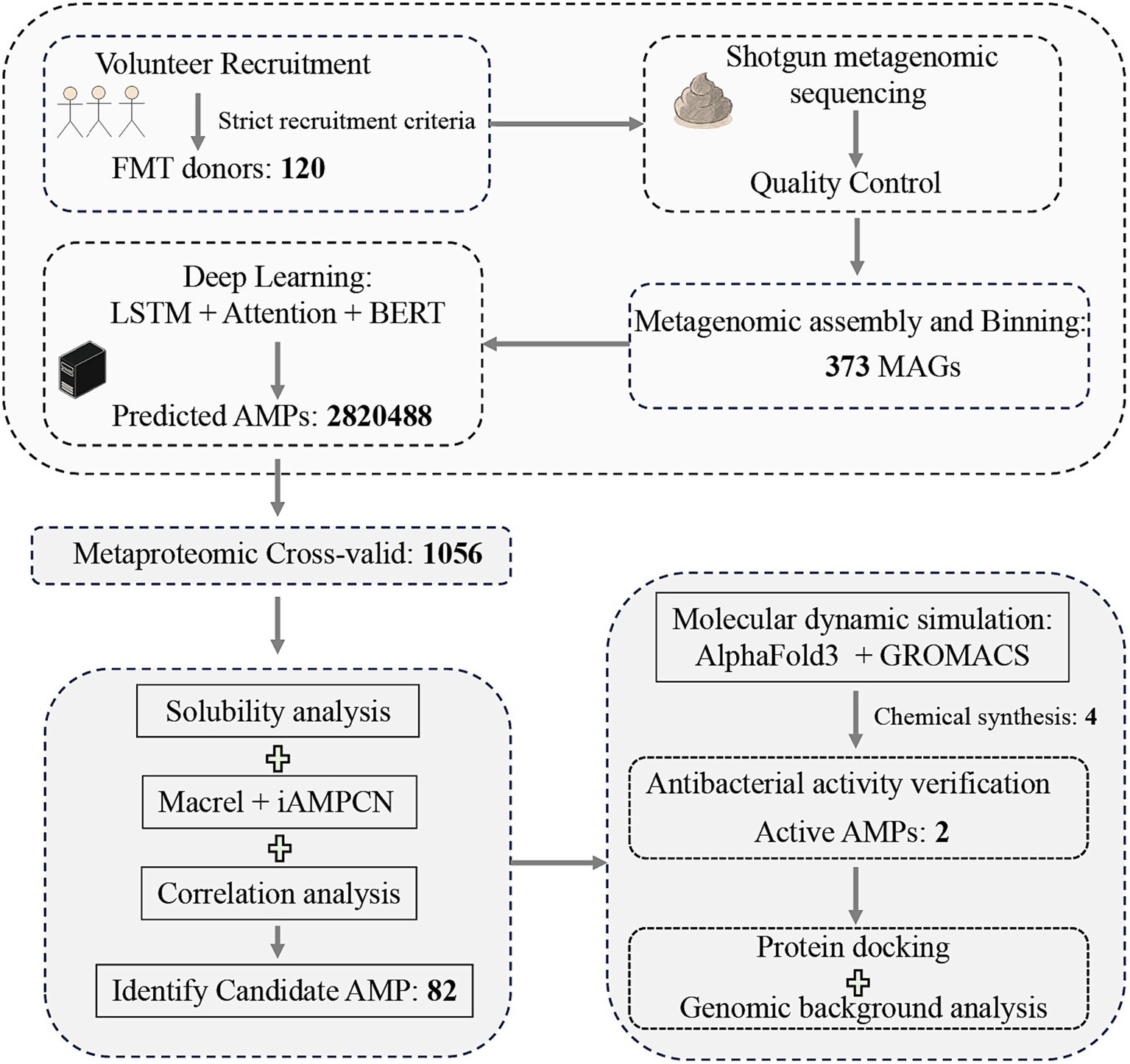 Methods: We employed metagenomics in combination with deep learning to mine AMPs from the 120 fecal microbiota transplantation (FMT) donor metagenome. Subsequently, a comprehensive analysis of the candidate AMPs was conducted through metaproteomic cross-validation, solubility analysis, cross-validation with other prediction tools, correlation analysis, and molecular dynamics simulations. Finally, four candidate AMPs were selected for chemical synthesis, and experimental validation identified two with broad-spectrum antimicrobial activity. Furthermore, molecular docking was utilized to further analyze the antimicrobial mechanisms of the candidate AMPs.