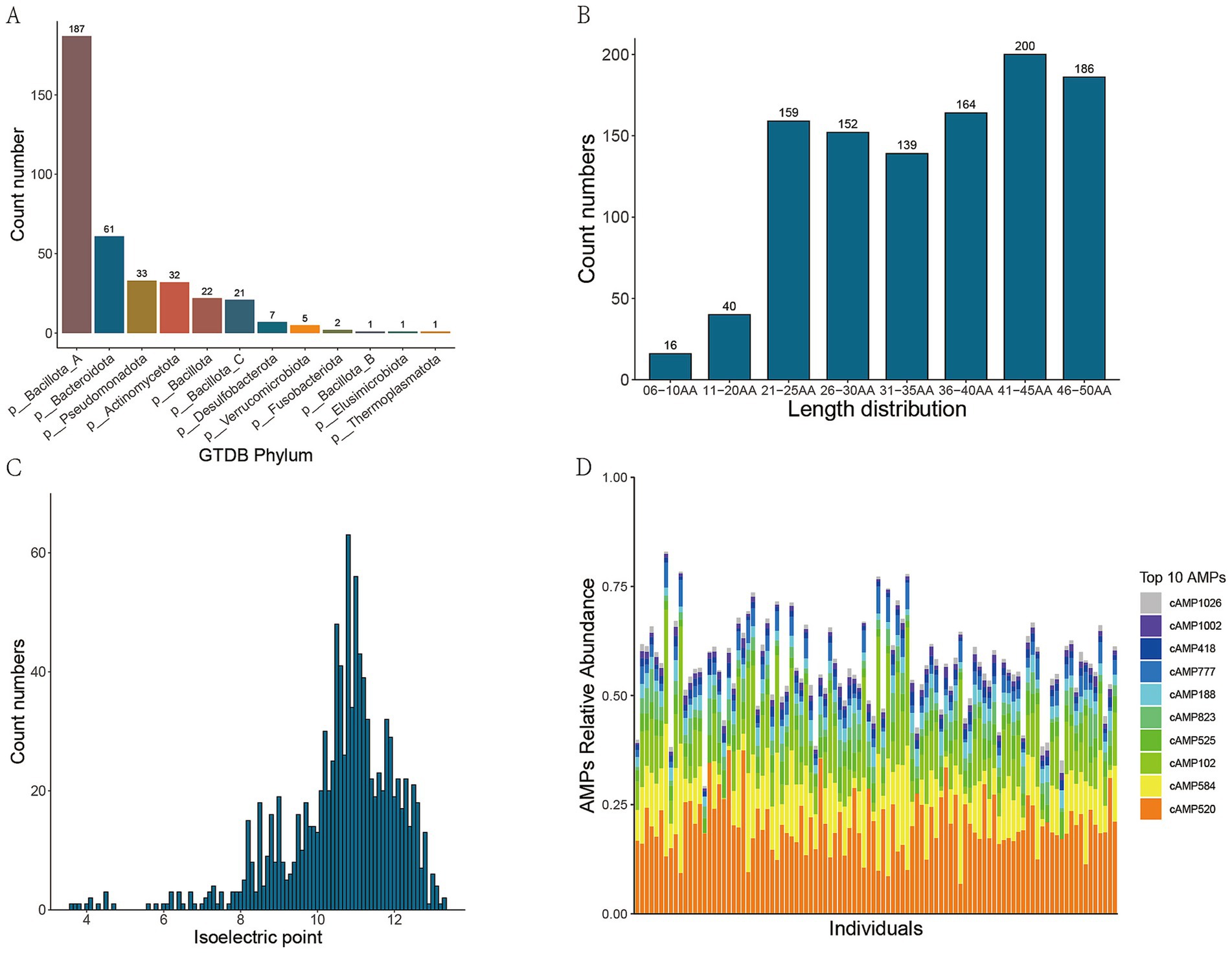 Figure 2. Metagenomic binning and species classification annotation results. (A)Phylum-level taxonomic distribution of the non-redundant, high-quality metagenome-assembled genomes (MAGs); (B) Bar chart depicting the length distribution of candidate AMPs through deep learning; (C) Distribution of isoelectric points of candidate AMPs; (D) The top 10 candidate AMPs by relative abundance in metagenomic samples from healthy individuals.