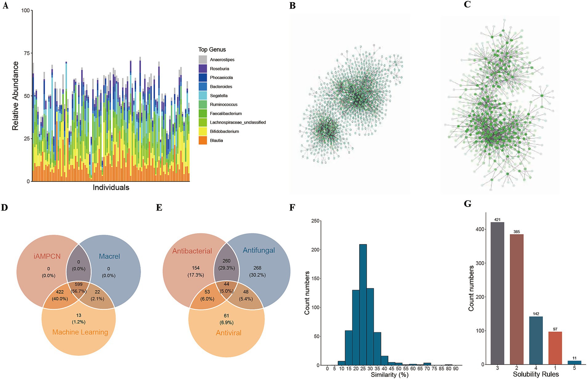 Figure 3. Correlation analysis results for enhancing the reliability of candidate antibacterial peptides. (A) Bar plot of the top 10 most abundant bacterial genera in the healthy cohort; (B) Negative interaction network between antibacterial peptides and bacteria at the species level in the healthy cohort; (C) Negative interaction network between antibacterial peptides and bacteria at the genus level in the healthy cohort; (D) The number of 1,056 candidate AMPs by Cross-validation results between two third-party tools, iAMPCN and Macrel; (E) Distribution of antibacterial peptides predicted by iAMPCN to have antibacterial, antifungal, and antiviral activities; (F) Similarity of candidate AMPs to antibacterial peptide sequences in the AMPSphere database; (G) Statistics of AMPs meeting different solubility evaluation criteria.