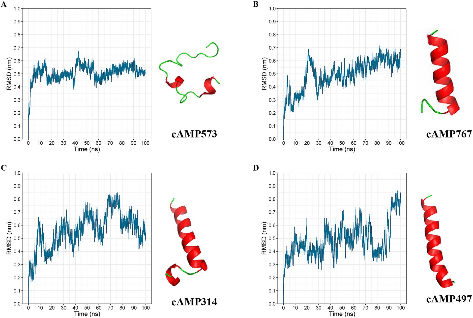 Figure 4. Molecular dynamics simulation results of AMPs. (A), (B), (C), and (D) present the molecular dynamics simulation results of candidate AMPs cAMP573, cAMP767, cAMP314, and cAMP497, respectively. The left graphs show the molecular dynamics simulation results from GROMACS over a simulation time of 100 ns; the right side displays the predicted three-dimensional structures of the antibacterial peptides by AlphaFold 3.