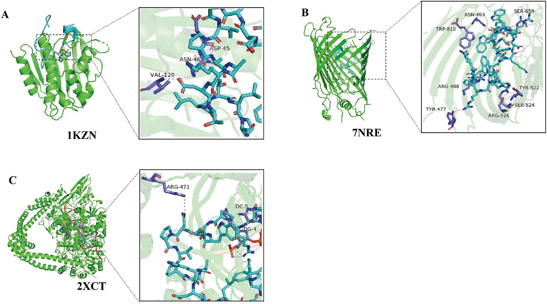 Figure 5. Simulated Docking Results between candidate AMP cAMP573 and Bacterial Proteins. (A) Simulated docking result between cAMP573 and protein 1KZN; (B) Simulated docking result between cAMP573 and protein 7NRE; (C) Simulated docking result between cAMP573 and protein 2XCT.