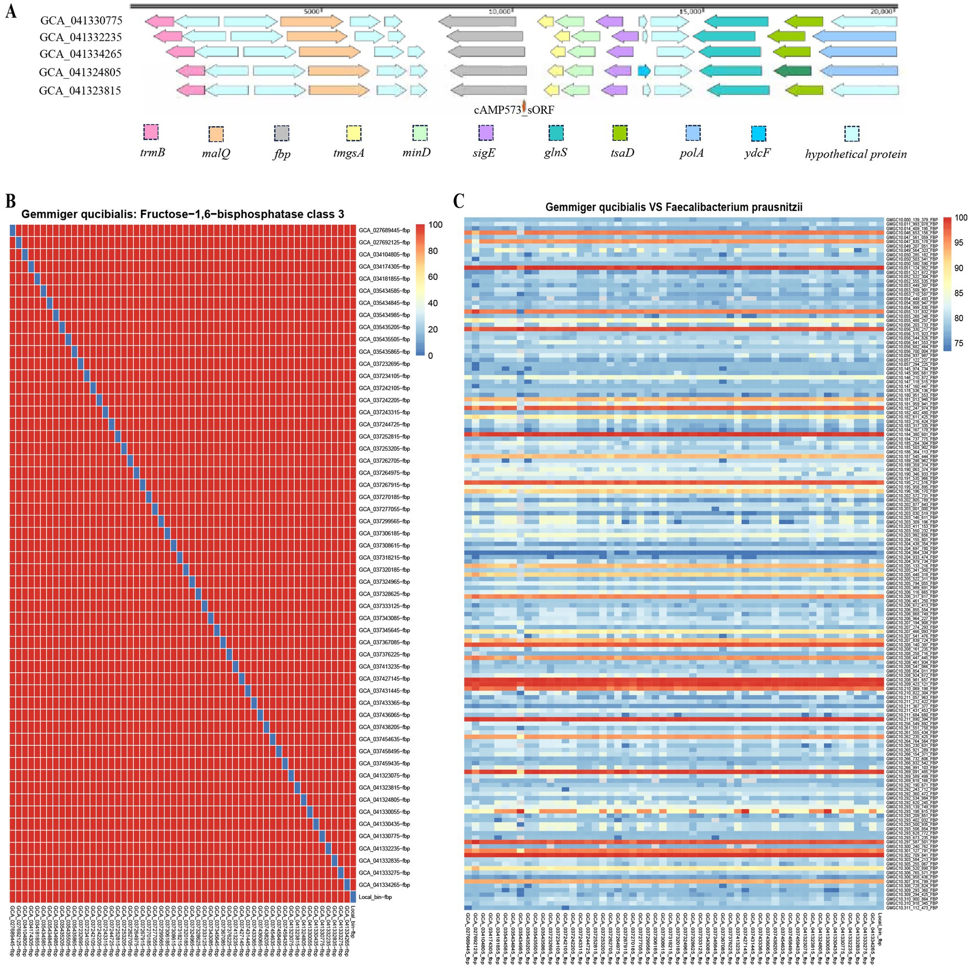 Figure 6. Genomic background information analysis results of sORFs encoding antibacterial peptides. (A) Genomic background information of the sORF encoding cAMP573; (B) Similarity analysis of the fbp gene across different G. qucibialis genomes; (C) Similarity analysis of the fbp gene between G. qucibialis and F. prausnitzii genomes.