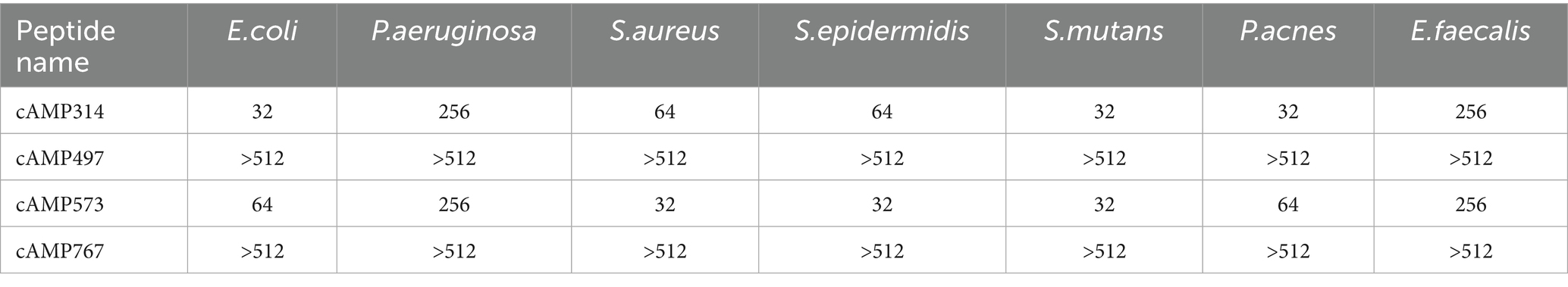 We successfully synthesized 4 screened peptides by solid-phase peptide synthesis and tested the antibacterial activity of AMPs against E. coli CICC 10667, P. aeruginosa JCM5962 and S. aureus ATCC6538, S. epidermidis CMCC26069, S. mutans ATCC 25175, P. acnes ATCC 6919 and E. faecalis ATCC19433. Among them, two peptides (cAMP314 and cAMP573) exhibited broad-spectrum antimicrobial activity, inhibiting all seven selected indicator bacterial strains with MIC ranging from 32 to 256 μg/mL. However, the other two peptides were unable to completely inhibit the activity of the indicator bacteria (Table 2).