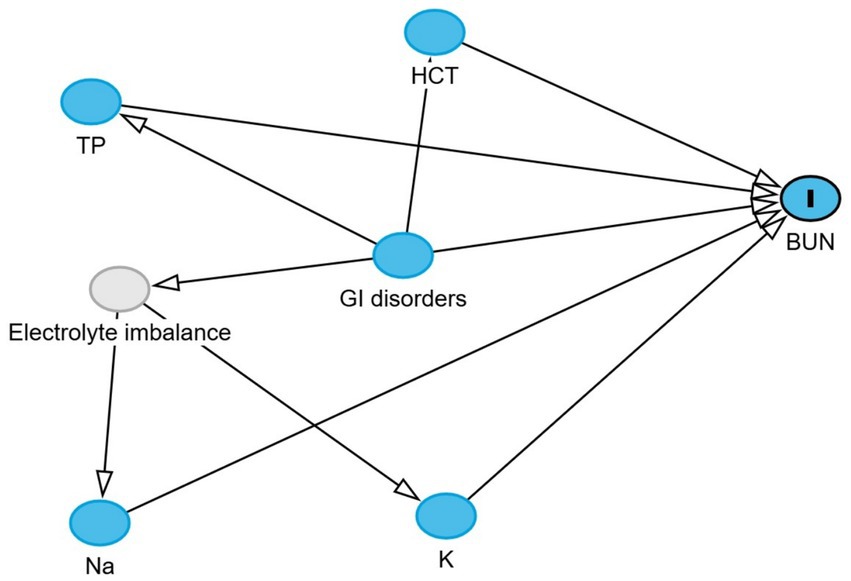 Figure 1. Directed acyclic graph describes the relationship of measured variables to blood urea nitrogen in dromedary camels. BUN: blood urea nitrogen. Ancestors of outcome (blue): gastrointestinal (GI) disorders, total protein (TP), hematocrit (HCT), sodium (Na), and potassium (K). Latent variable (light gray): Electrolyte imbalance.