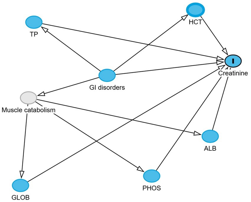 Figure 2. Directed acyclic graph describes the relationship of measured variables to creatinine in dromedary camels. Ancestors of outcome (blue): gastrointestinal (GI) disorders, total protein (TP), hematocrit (HCT), globulin (GLOB), albumin (ALB), and phosphorus (PHOS). Latent variable (light gray): Muscle catabolism.
