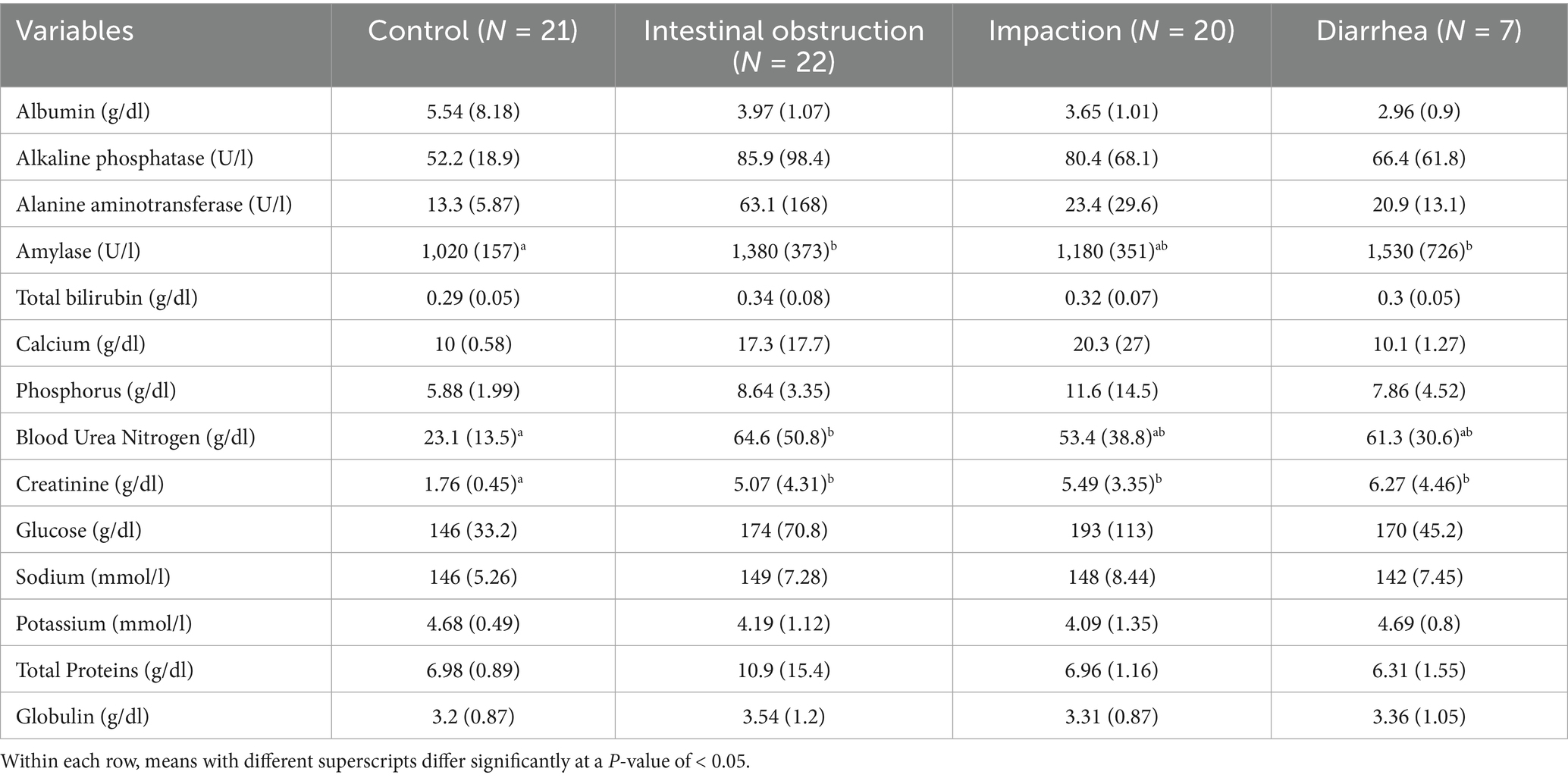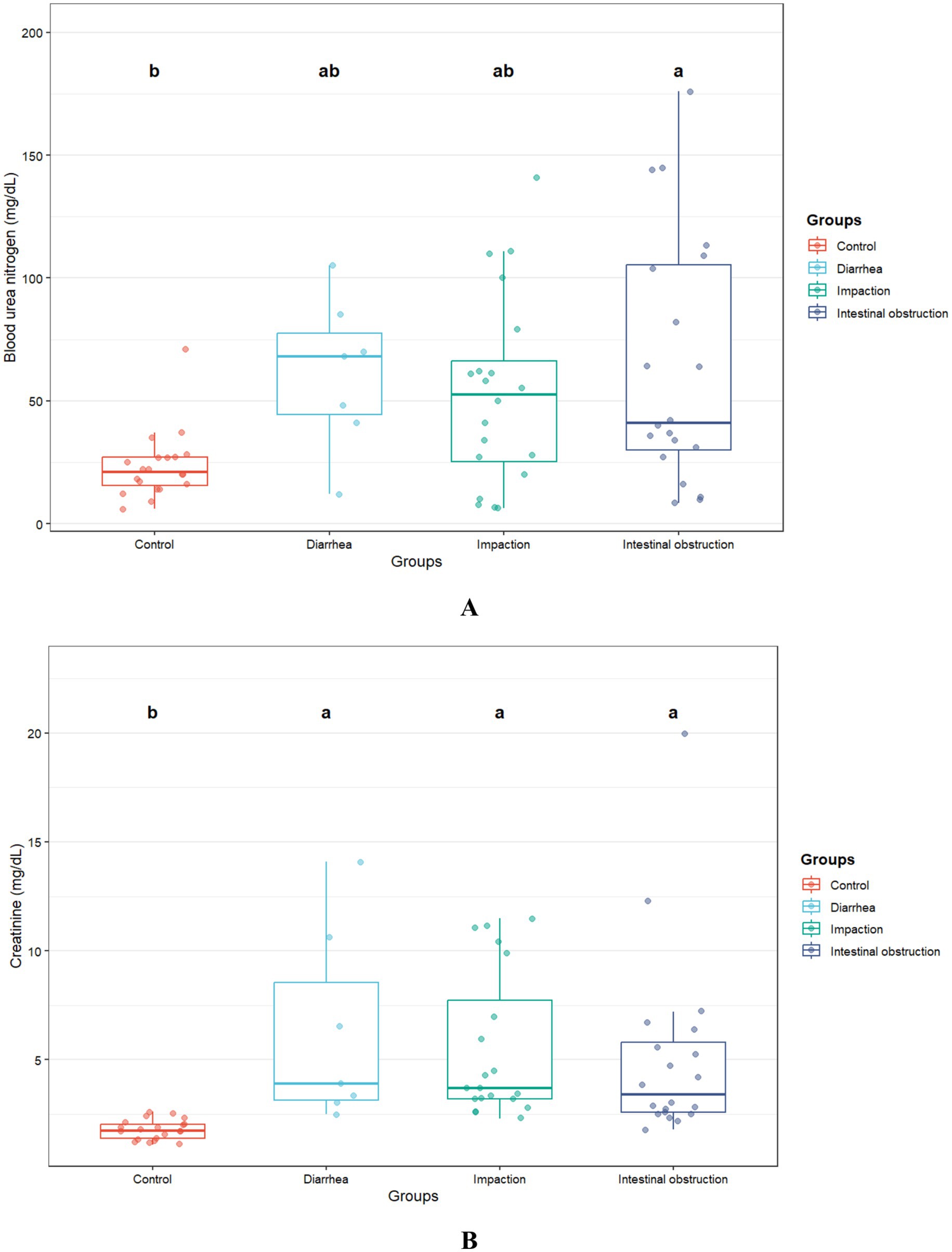 Figure 3. Blood urea nitrogen (A) and creatinine (B) concentrations in camels with diarrhea (n = 7), gastric impaction (n = 20), and intestinal obstruction (n = 23) compared to healthy controls (n = 21). Different superscript letters indicate significant differences (p < 0.05).