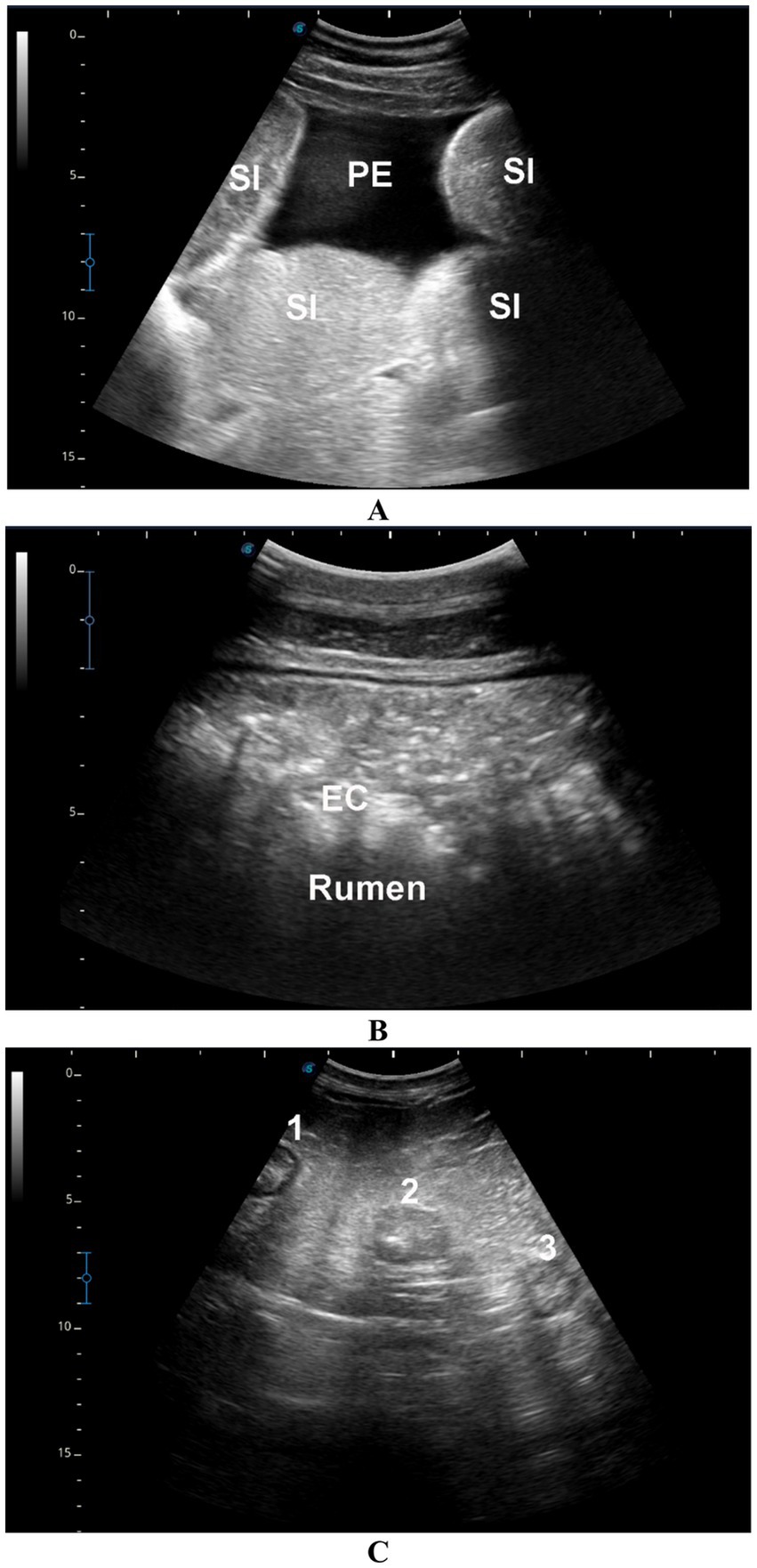 Figure 4. Ultrasonographic findings in camels with gastrointestinal disorders. (A) Distended small intestinal loops (SI) with mild echoic peritoneal effusion (PE) in a male camel with intestinal obstruction. (B) Echogenic rumen contents (EC) in a male camel with rumen impaction. (C) Enlarged mesenteric lymph nodes (labeled 1, 2, 3) in a female camel with a 7-day history of diarrhea.