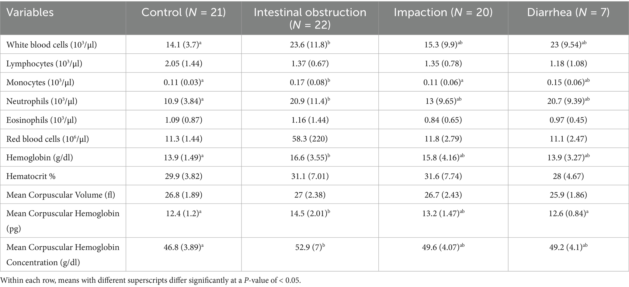 Statistical analyses were performed using R version 4.4.2 (R Foundation for Statistical Computing, Vienna, Austria). Differences in the hematological and biochemical findings among the four groups (control, intestinal obstruction, diarrhea, and impaction) were assessed using one-way analysis of variance (ANOVA). When significant differences were detected, pairwise comparisons were performed using Tukey’s honestly significant difference (HSD) post-hoc test. Data are expressed as mean ± standard deviation (SD), and a p-value of < 0.05 was considered statistically significant.