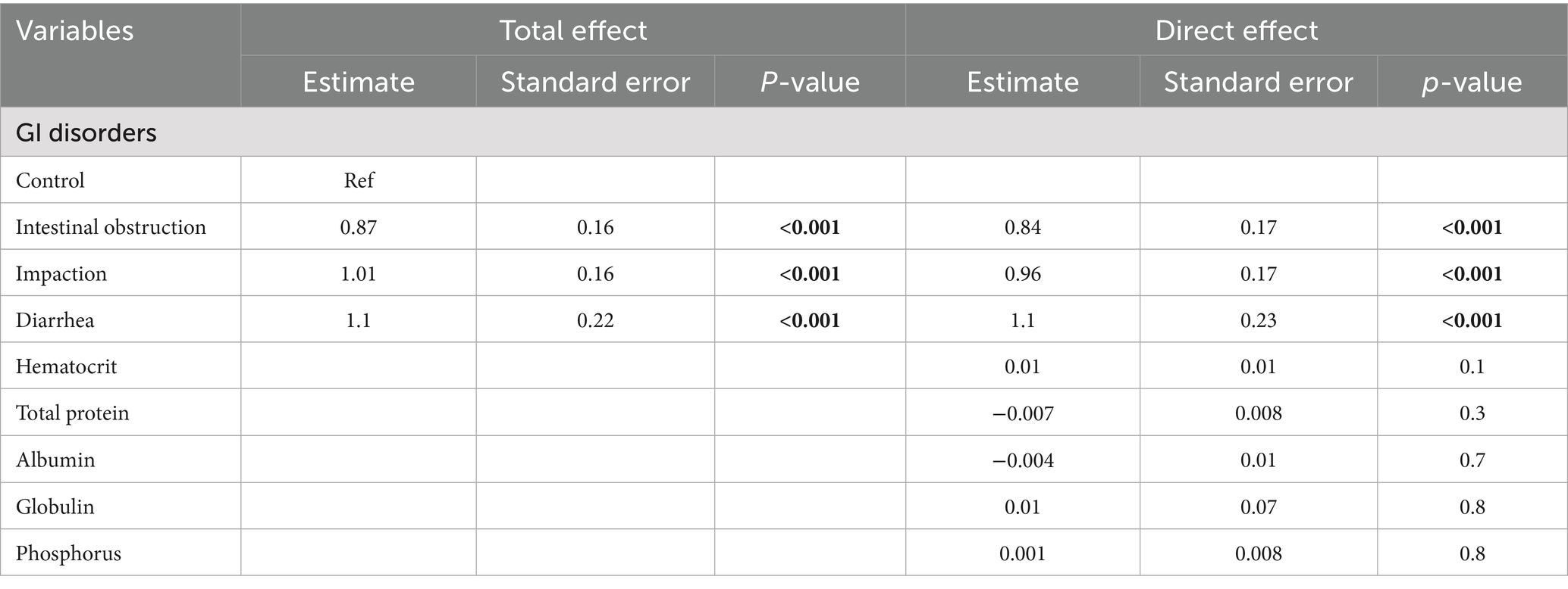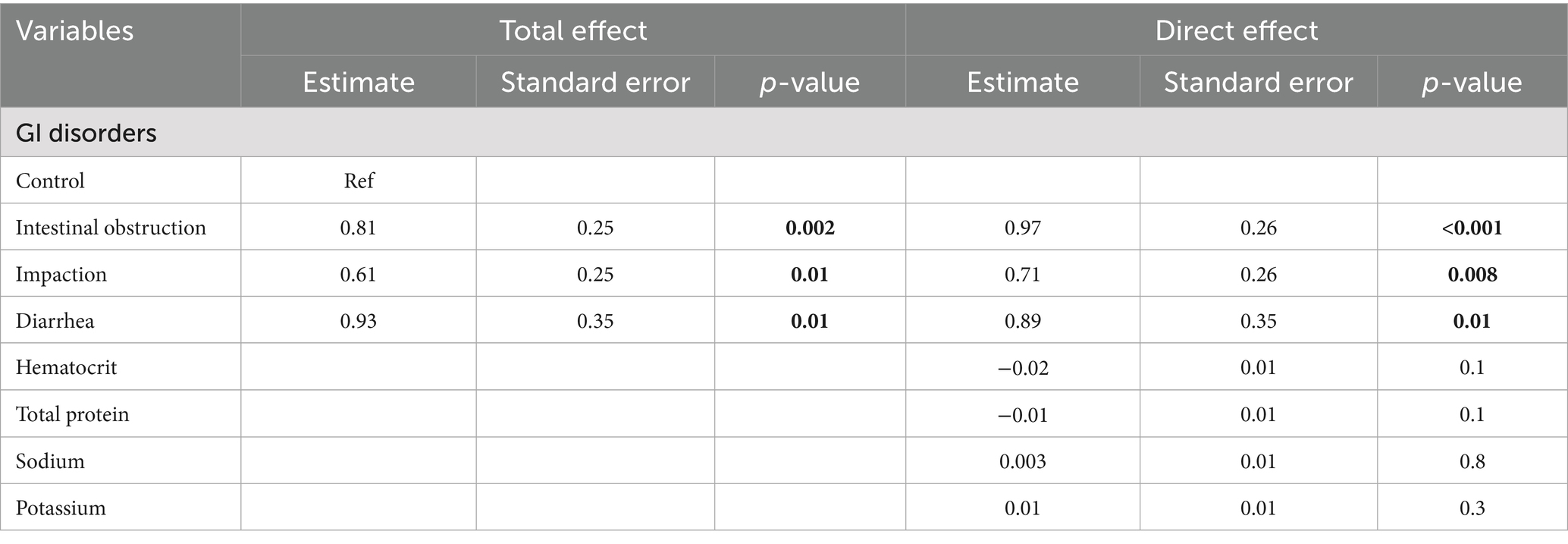 In the unadjusted model assessing the total effect, intestinal obstruction, impaction, and diarrhea were each associated with significantly higher creatinine levels. Specifically, intestinal obstruction was associated with a 2.4-fold increase (p < 0.001), impaction with a 2.7-fold increase (p < 0.001), and diarrhea with a 3.0-fold increase (p < 0.001) compared to the control group. After controlling for hematocrit, total protein, phosphorus, globulin, and albumin, the direct effects remained largely unchanged: intestinal obstruction (2.3-fold increase, p < 0.001), impaction (2.6-fold increase, p < 0.001), and diarrhea (3.0-fold increase, p < 0.001). Table 4 presents the results of both models. None of the blood parameters included in the models showed significant associations with the outcomes.