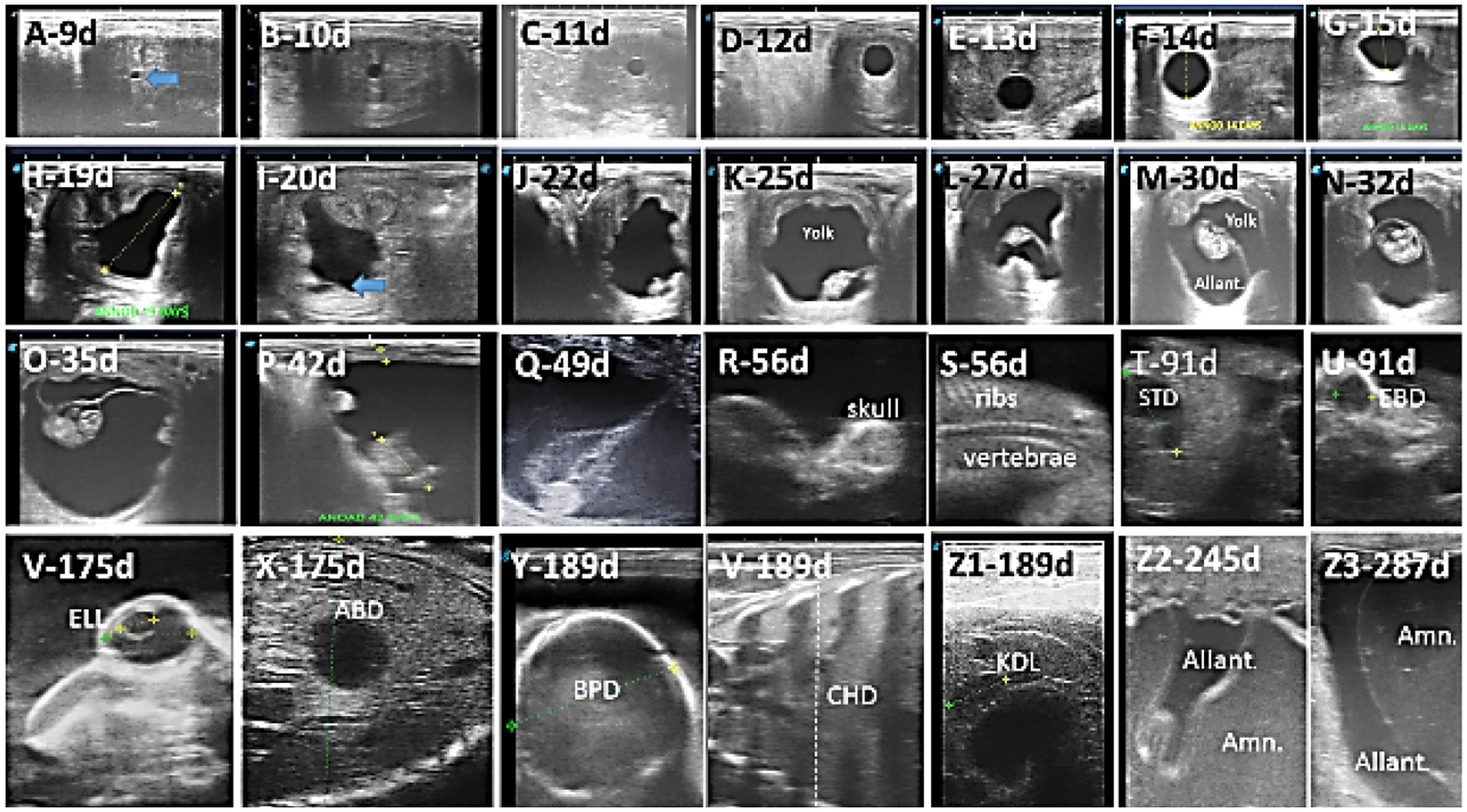Figure 1. Ultrasound images depict the different developmental stages in the Arabian horse conceptus. (A–H) Beginning of detection and change in the size and shape of the embryonic vesicle, EV; (I–Q) conceptus is first observed, with changes in length and position within the embryonic vesicle, as well as changes in yolk and allantotic fluid volume; (M–O) development of the head, body, and limbs; (R,S) start of ossification in skull, vertebrae, and ribs; (T–Z1) measure the stomach diameter (STD), eyeball diameter (EBD), lens (ELL), abdominal diameter (ABD), biparietal diameter (BPD), chest depth (CHD), and kidney length (KDL); (Z2,Z3) increased amniotic fluid and allantoic.