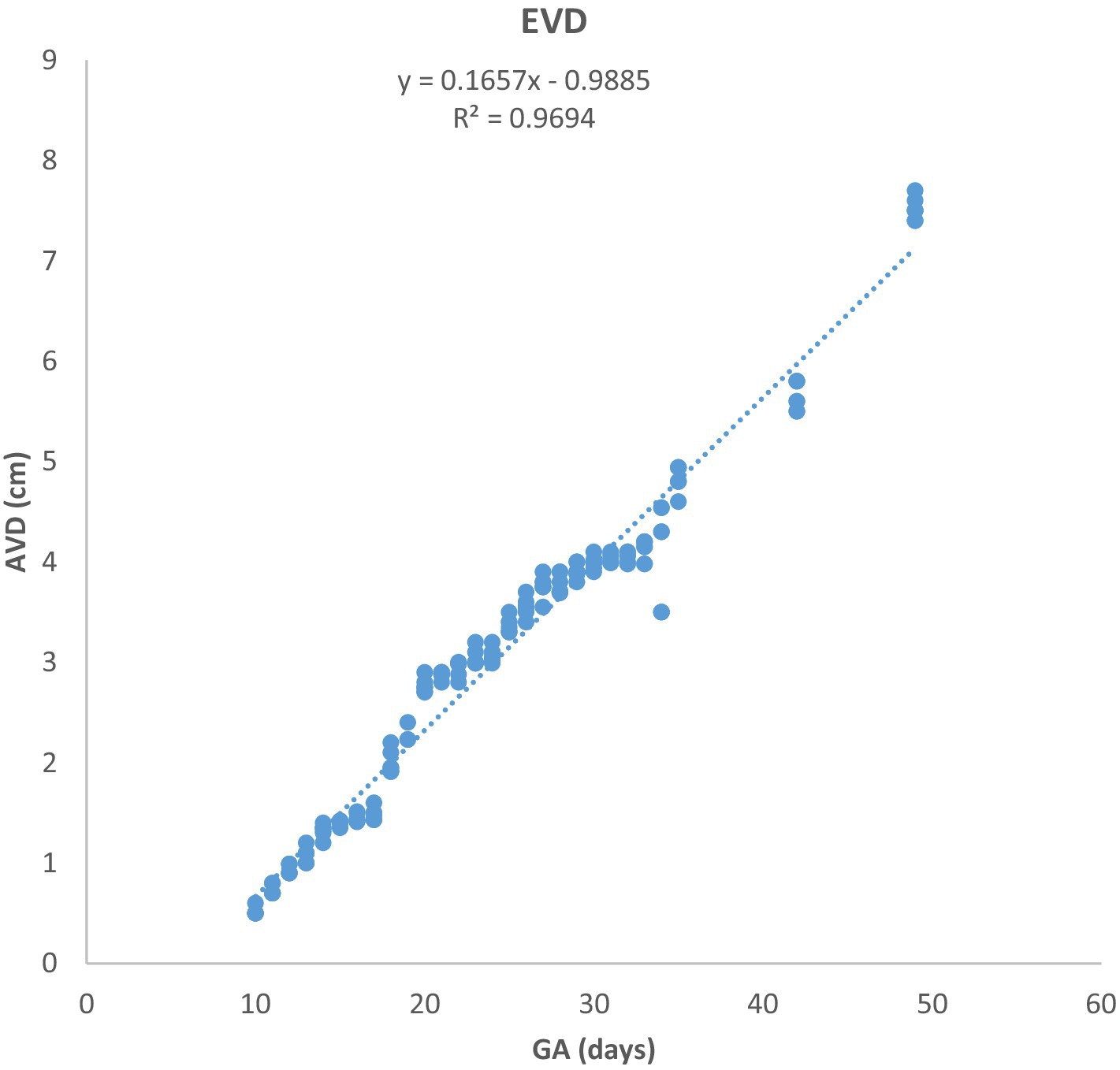 Figure 2. Growth of the amniotic vesicle diameter (EVD) in Arabian mares (n = 7). EVD increased linearly with gestational age (GA). Regression analysis showed a highly significant correlation (p < 0.0001, R2 = 0.9694).