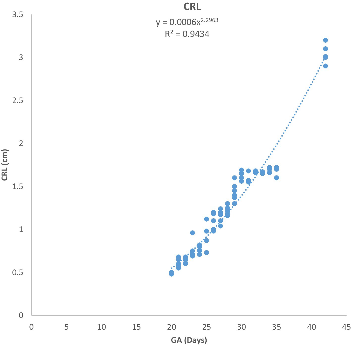 Figure 3. Changes in crown-rump length (CRL) during pregnancy in Arabian horses (n = 7). CRL growth was initially slow, then accelerated with advancing GA. Correlation was highly significant (p < 0.0001, R2 = 0.9434).