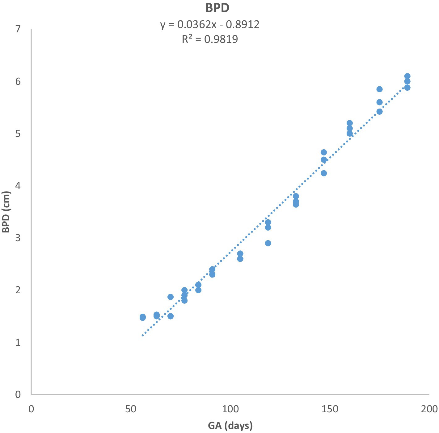 Figure 4. Biparietal diameter (BPD) growth in Arabian horses (n = 7). BPD increased linearly with GA. Regression showed a highly significant correlation (p < 0.0001, R2 = 0.9824).