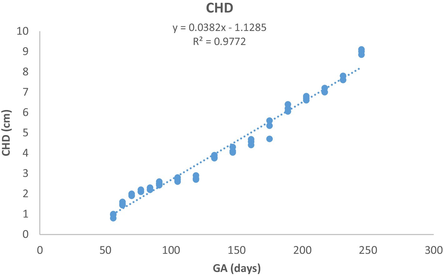Figure 5. Chest depth (CHD) development during pregnancy in Arabian horses (n = 7). CHD grew linearly with GA, showing a highly significant correlation (p < 0.0001, R2 = 0.9772).