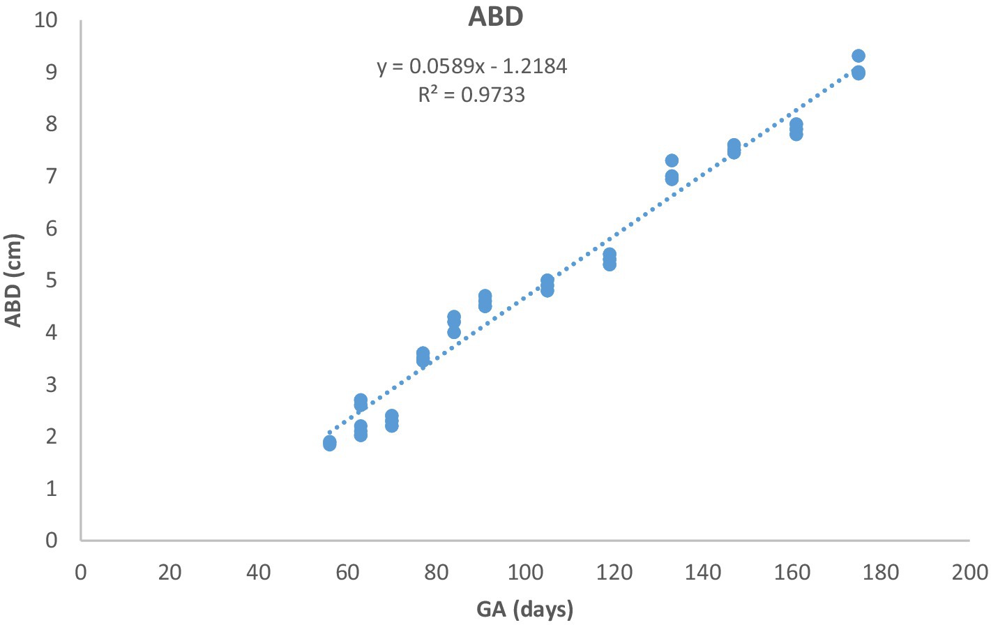 Figure 6. Abdominal diameter (ABD) growth in Arabian horses (n = 7). ABD increased linearly with GA. Regression was highly significant (p < 0.0001, R2 = 0.9733).