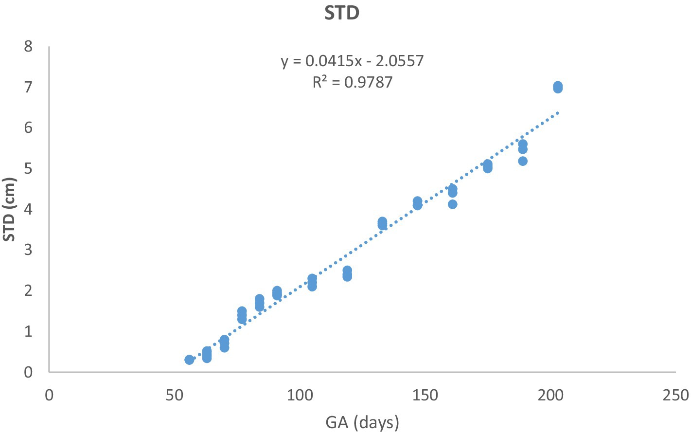 Stepwise regression and correlation models were fitted to evaluate the relationship between gestational age and each of the studied parameters. The various measurements were considered to be dependent on gestational age. A 5% significance level was used. For data analysis, version 18.0 of the IBM SPSS computer program was used. Data were expressed as mean ± SD or percentages.
