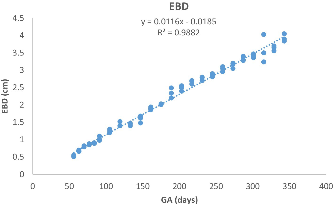 Results: The EV, embryo proper, organization, and ossification were visualized at days 10.3 ± 0.5, 21.3 ± 1.3, 33.6 ± 2.0, and 57.7 ± 3.5, respectively. All biometric parameters, except CRL, ELL, and KDL, exhibited strong linear correlations with gestational age (P < 0.0001). Fetal sexing was feasible between days 56 and 161, with maximum accuracy (98%) and applicability (64.9%) between days 105 and 133.