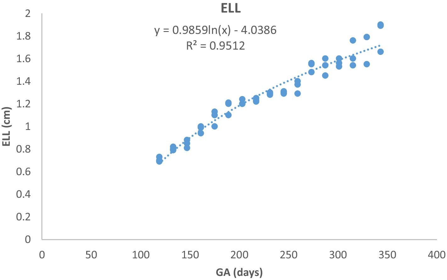 Figure 9. Eye lens length (ELL) growth in Arabian horses (n = 7). ELL followed a curvilinear pattern: rapid growth early, slowing later. Correlation was highly significant (p < 0.0001, R2 = 0.9512).