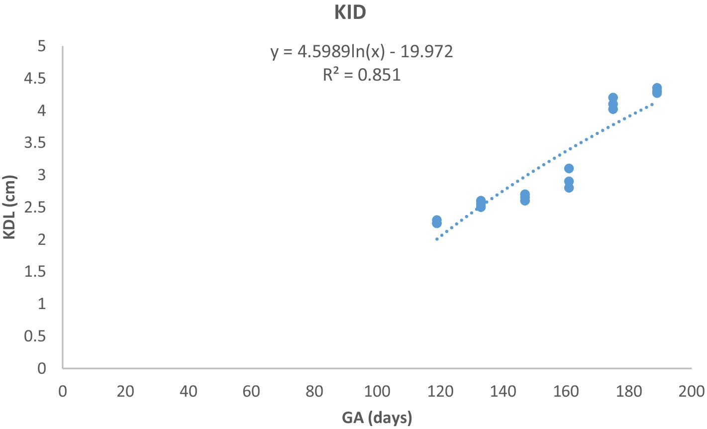Figure 10. Kidney length (KDL) changes during pregnancy in Arabian horses (n = 7). KDL showed a curvilinear pattern, with rapid early growth followed by a slower increase. Correlation was highly significant (p < 0.0001, R2 = 0.851).