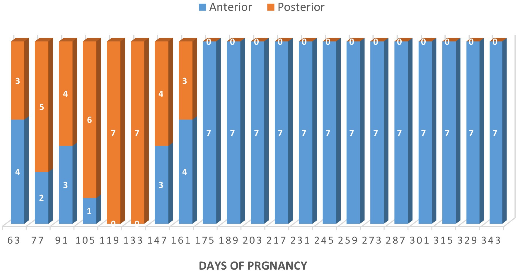 The fetuses changed their presentation frequently until day 161 of pregnancy. From day 175 onward, all fetuses were in the anterior presentation (Figure 11). Two weeks before parturition, all fetuses were in a dorso-pubic position, with the two forelimbs flexed at the carpal joints.