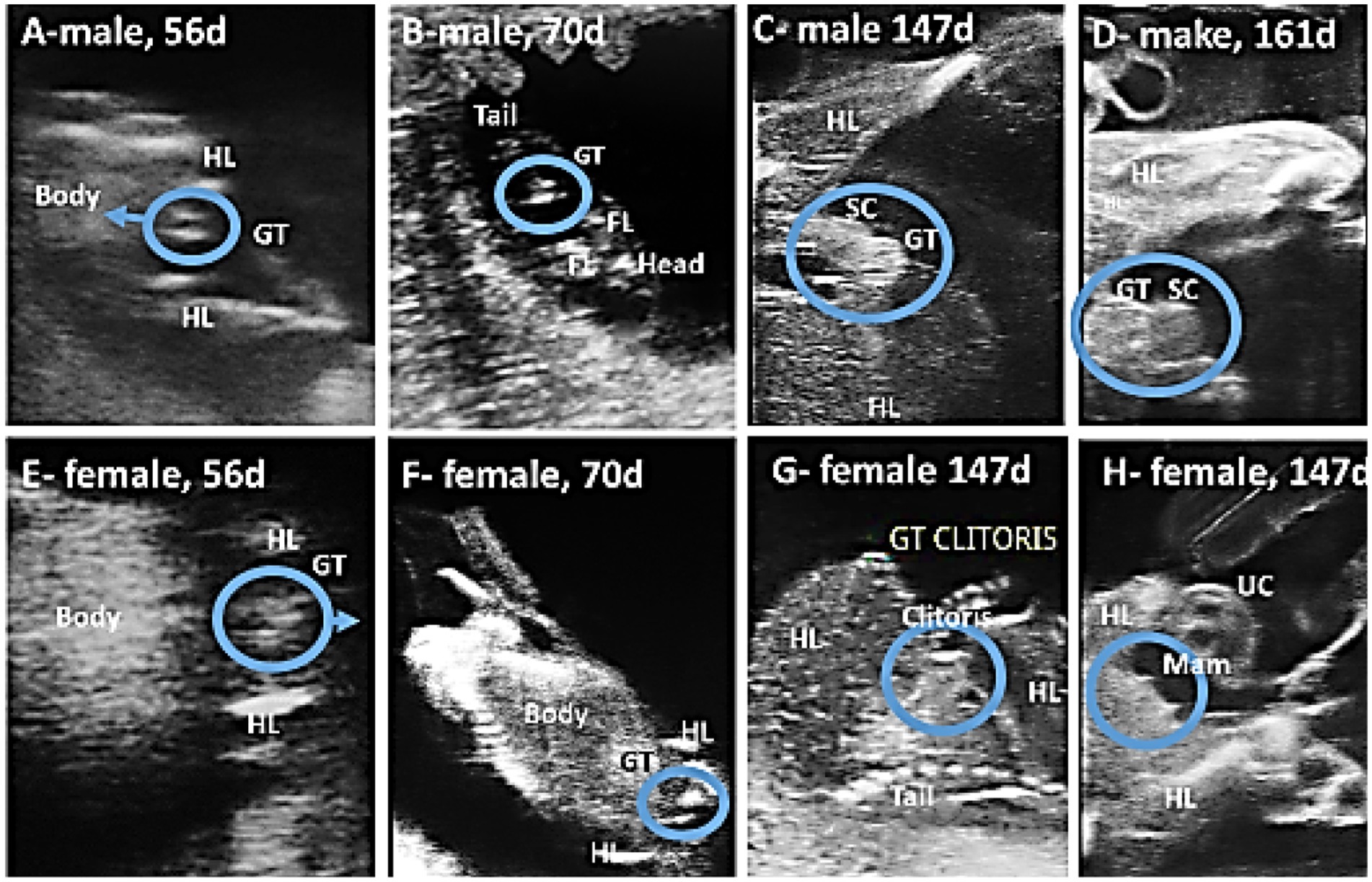 Figure 12. Using ultrasound to predict the gender of camel fetuses. In the ventral view of the male fetus (A,B), the genital tubercle (GT) advances anteriorly until it reaches the junction of the umbilical cord (UC) and the fetus, whereas in the female fetus (E,F), the genital tubercle is located posterior to the hind limbs (HL) and gradually moves backward toward the tail. As pregnancy progresses, the scrotum (SC) appears between the hind limbs in males (C,D) and opposite the clitoris and mammary glands (Mam) in females (G,H).