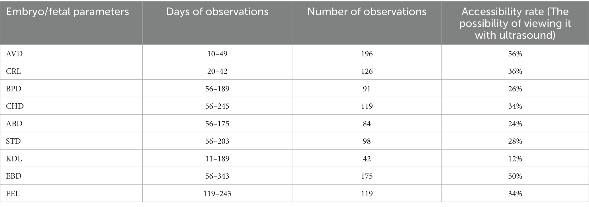 Accessibility of the different fetal organs and parts for ultrasonic examinations depended on the day of gestation and the technique of examination. The AVD and CRL were accessible only during early pregnancy; subsequently, they became excessively lengthy to be displayed effectively on the screen in their entirety. The BPD, CHD, ABD, STD, EBD, and ELL could be scanned during mid-gestation. EBD and ELL were within the range of the ultrasound beam during mid-gestation and late-gestation. Table 2 shows the accessibility of different fetal parts and organs during the total gestational period.