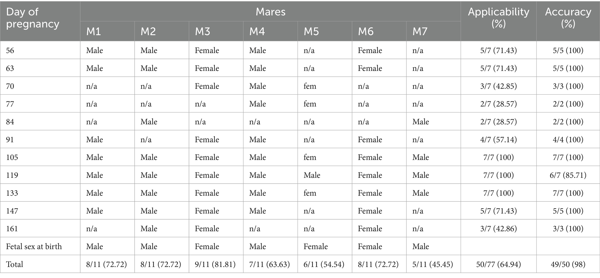 Discussion and conclusion: Ultrasonographic monitoring provides reliable parameters for assessing fetal growth and estimating gestational age in Arabian horses. The period between days 105 and 133 of gestation represents the optimal window for accurate fetal sex determination. These findings enhance reproductive monitoring and breeding management practices in Arabian horse herds.