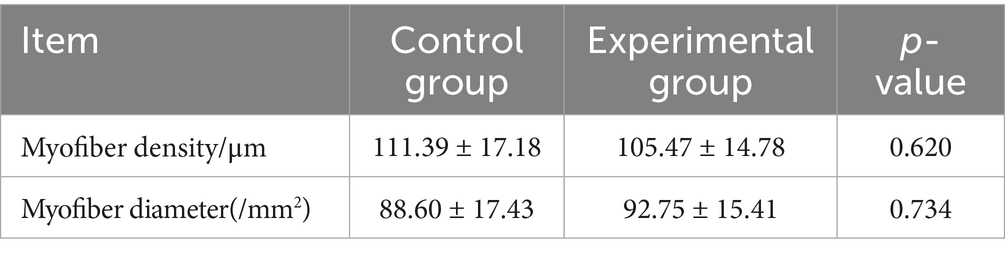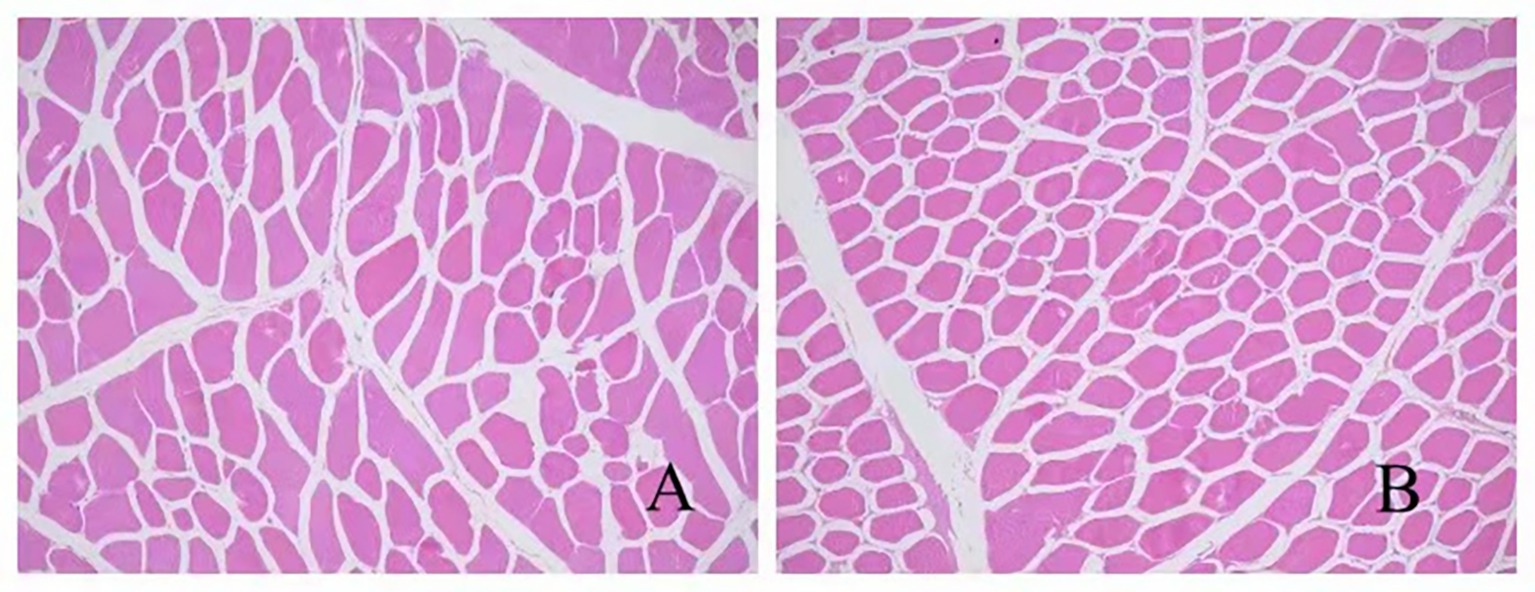 The collected muscle samples were sectioned and stained, and myofiber characteristics were observed under a microscope using the following methods: Myofiber diameter: The longest distance between two points on the cross-section was measured as the major axis, while the shortest distance perpendicular to the major axis was defined as the minor axis. Multiple measurements were performed to calculate the average values. Myofiber density: The area of each field of view was calculated, and the number of muscle fibers within each field of view was counted.