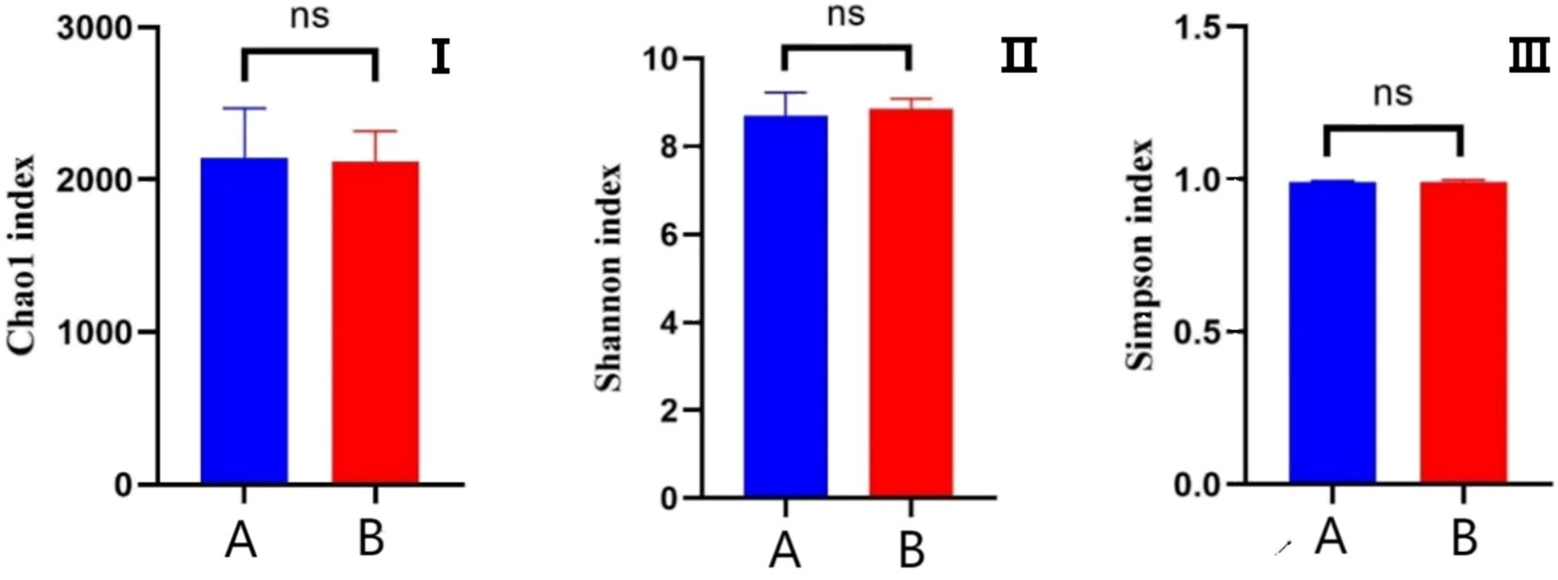 Figure 2. Analysis of α-diversity of the cecal microbiota (I: Chao 1 index; II: Shannon index; III: Simpson index; A: control group, B: experimental group).