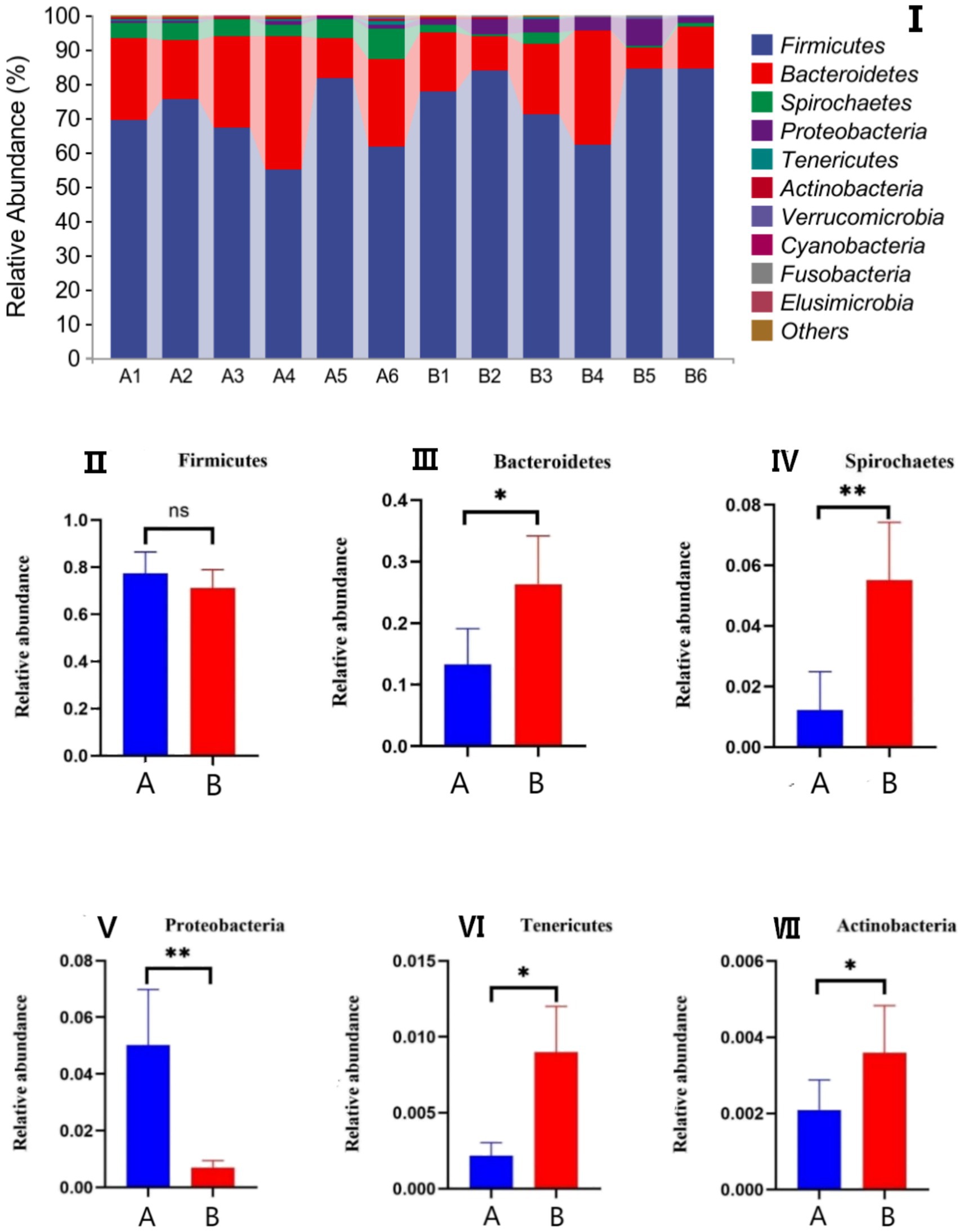 Figure 4. Effects of AFF on the relative abundance of the gut microbiota at the phylum level (I) and its dominant bacteria (II–VII). (A: control group, B: experimental group).