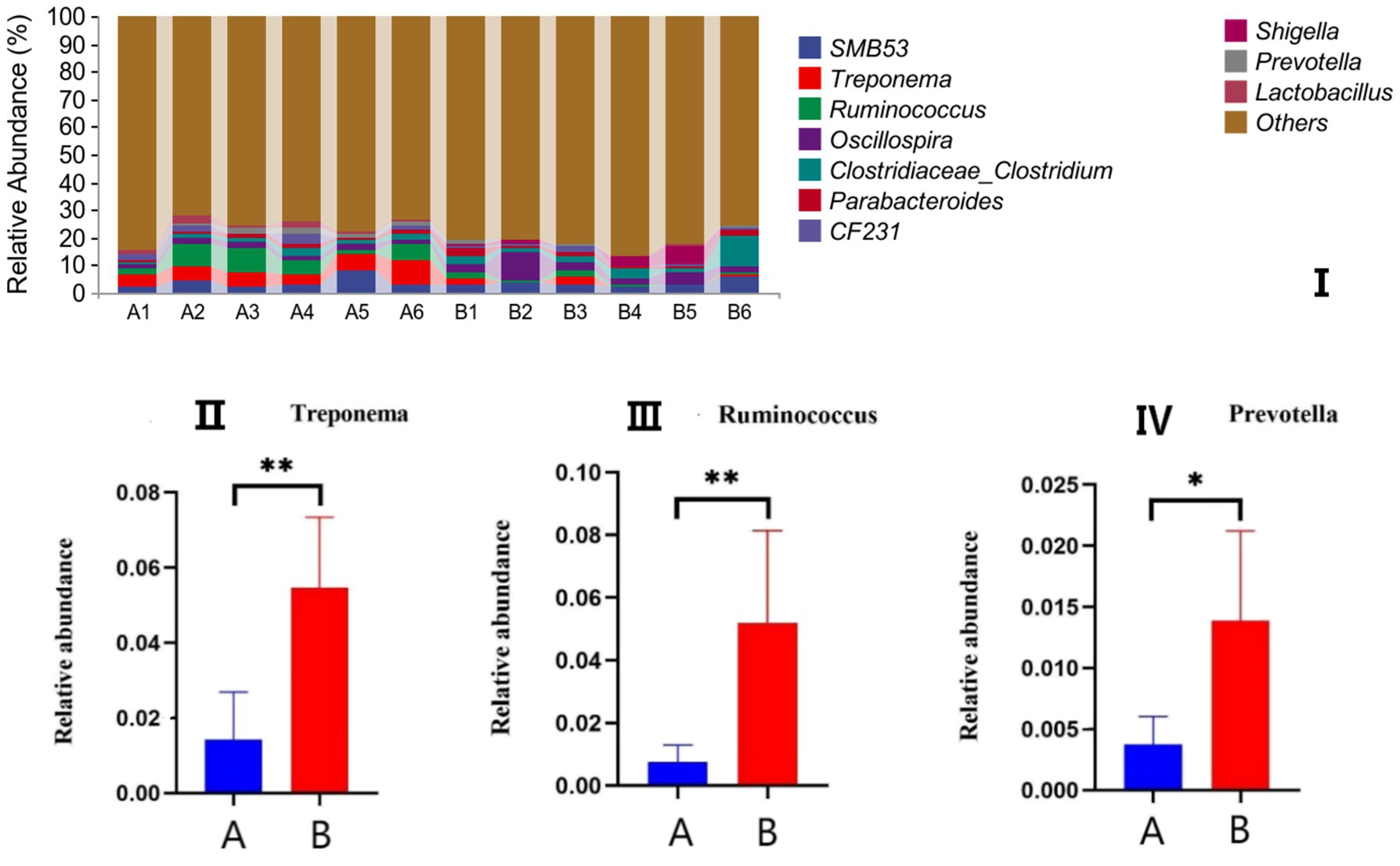 Figure 5. Effects of AFF on the relative abundance of the gut microbiota at the genus level (I) and its dominant bacteria (II–VII). (A: control group, B: experimental group).