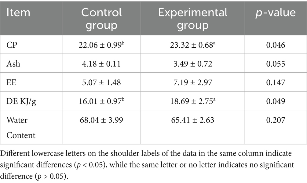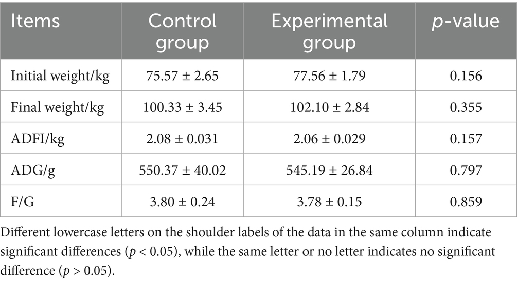 As shown in Table 2, compared to the control group, the experimental group showed no significant differences (p > 0.05) in ADFI, F/G, IBW, FBW, or ADG.