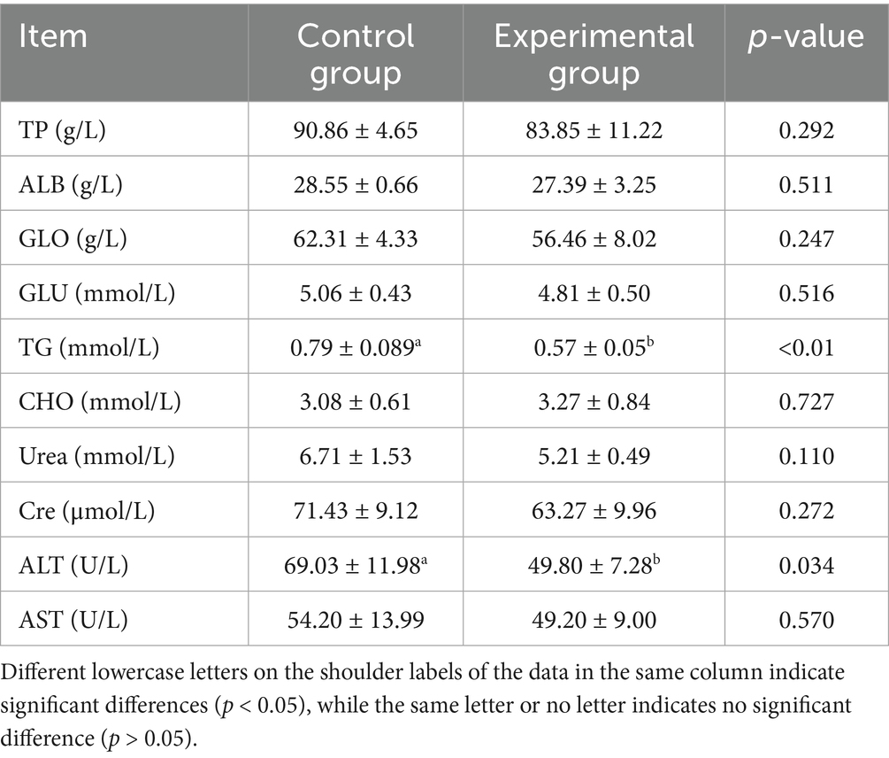 As shown in Tables 3, 4, substituting 50% of the basal diet with AFF significantly decreased serum TG and ALT levels by 27.85% (p < 0.05) and 27.86% (p < 0.05), respectively, compared to the control group. No significant differences were observed in TP, ALB, GLB, GSH, CHO, urea, Cre, or AST levels (p > 0.05). Regarding antioxidant status, the substitution markedly reduced MDA content by 66.24% (p < 0.05), while no significant effects were noted on GSH-Px, SOD, GSH, or T-AOC (p > 0.05).