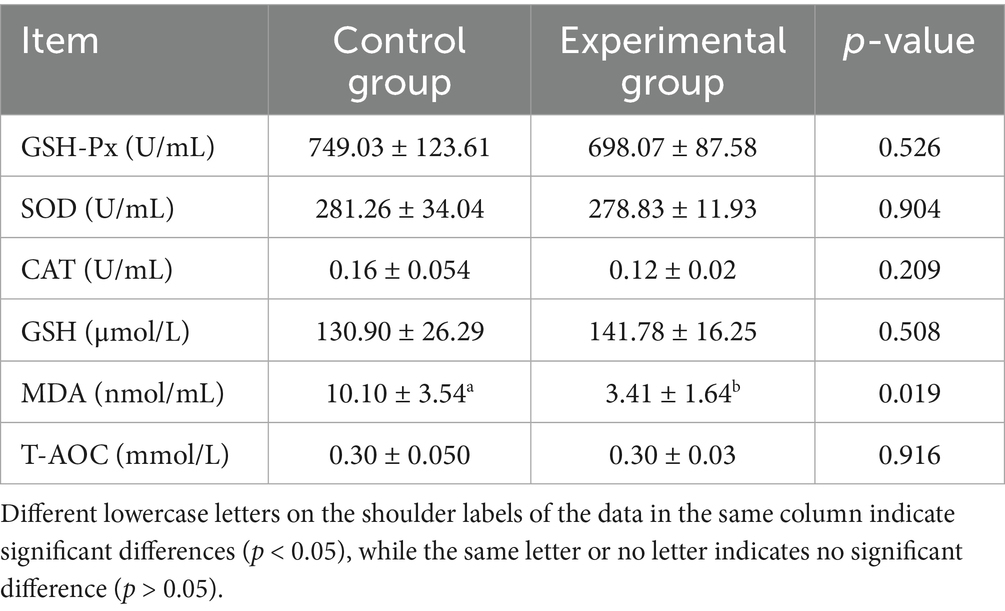 Total protein (TP), albumin (ALB), glucose (GLU), triglycerides (TG), alanine aminotransferase (ALT), aspartate aminotransferase (AST), total cholesterol (TC), creatinine, and urea nitrogen were determined using a fully automated biochemistry analyzer (BS-600, Mindray Bio-Medical Electronics Co., Ltd., Shenzhen, China), with globulin (GLB) levels calculated accordingly. Total antioxidant capacity (T-AOC), superoxide dismutase (SOD), glutathione peroxidase (GPX), malondialdehyde (MDA), and glutathione (GSH) in pig serum were measured using commercial assay kits (Nanjing Jiancheng Bioengineering Institute, China) according to the manufacturer’s protocols, with a microplate reader (SpectraMax M5, Molecular Devices, USA).